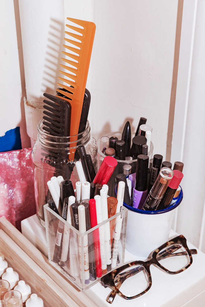 One thing I do in my makeup routine when I'm going out or hosting a party or something, I've collected a bunch of pigments, like eyeshadows and stuff. I'll do a bold blue, or some kind of glitter or something for a statement eye. When I was younger, eyeliner was my thing, but now I'm kind of over it. I like color—I have Make Up For Ever, Moonshot, and then this Christopher Kane Nars eyeshadow collaboration from a few years back. I play around with Make Beauty Molten Shadow, and Lid Star in Slip and Lily.