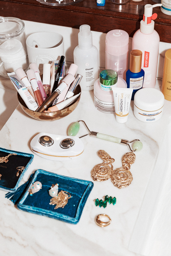 Before an event, you want to make sure you’re super well hydrated and well moisturized, because it also helps your makeup look good. If I know I’m going out, I sleep in a thin layer of a super moisturizing mask the night before, like our Moisturizing Moon Mask or the Valmont Renewing Pack, which I just picked up at Rescue Spa. And I always use Solution before makeup, because it makes an even texture for makeup to go on. I don’t want any dead skin on the surface—I want to be very cleansed, exfoliated, and moisturized. So I do that, and then the Oxygenating Serum from Biologique. I think it helps with congestion and buildup—I like preventing rather than treating. Then I slather on Priming Moisturizer Rich.
