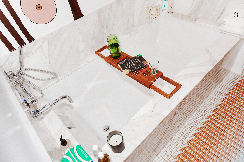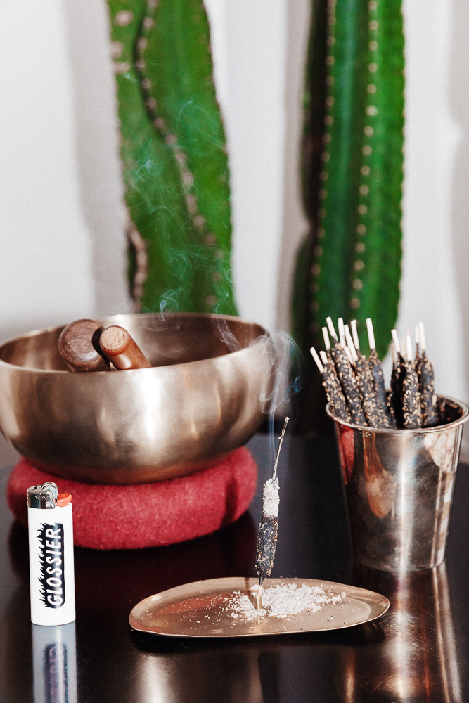 I also like to take a bath almost every night, even on nights when I’m going out. I’ve read a lot about bathing—in different cultures, bathing is more of a soak, not necessarily to clean. So I take a shower before I take a bath. In the shower, my favorite, favorite body product is Body Hero. I love the smell, I love the texture—it feels extremely luxurious, and it doesn’t make me dry at all. I think having something that smells really amazing—it has this incredible fresh orange scent—is really ritualistic. I do a lot of things with scent. Every morning I light my Palo Santo incense from Peru. I buy it in bulk from Incausa, which is a co-op that imports and works with different local communities in Brazil and Peru and Asia to create different products. It’s a very cool company. I love the scent memory—knowing that in the shower, it smells like Body Hero. It’s like an emotional anchor.