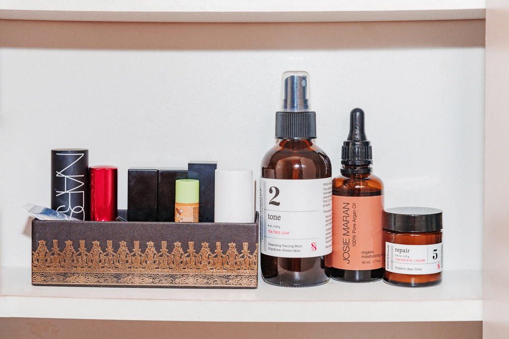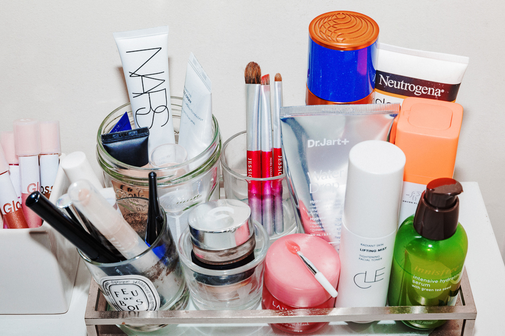 In the morning, I basically just do my toner, which is CLE Cosmetics Lifting Mist, and then Innisfree's Green Tea Serum, or Drunk Elephant C-Firma. That one has this 'reservoir effect,' so it lasts for like 72 hours, so I only use it every few days. On top of it I usually put sunscreen. Three of my day products have sunscreen. I first put on a Neutrogena Oil-Free Moisturizer with SPF—that has SPF 35 I think—and then Nars Primer, which has 50 SPF. Then, I finish with CLE Cosmetics CCC Cream, which also has SPF. That's my basic finish. I use Glossier Stretch Concealer every single day, applied with my fingers. Stretch Concealer is actually one of my favorite products. I have the Nars Soft Matte Pot Concealer, which is good for blemishes because it's matte. But I don't like looking like I haven't slept, and the Stretch Concealer is perfect for the undereye.