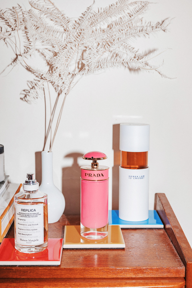 I have three fragrances right now, but I primarily use Replica by Margiela. It's called Beach Walk, and it's my favorite one. It's not girly—I would say most of those fragrances are unisex. This one's kind of toasted, a bit. It sort of smells like sun screen, and it definitely has a beach feel. And then I have Prada Candy, which is a little too sweet for me, but I like the bottle. It's cute. And then I have 10 Crosby's fragrance, which is Looking Glass.