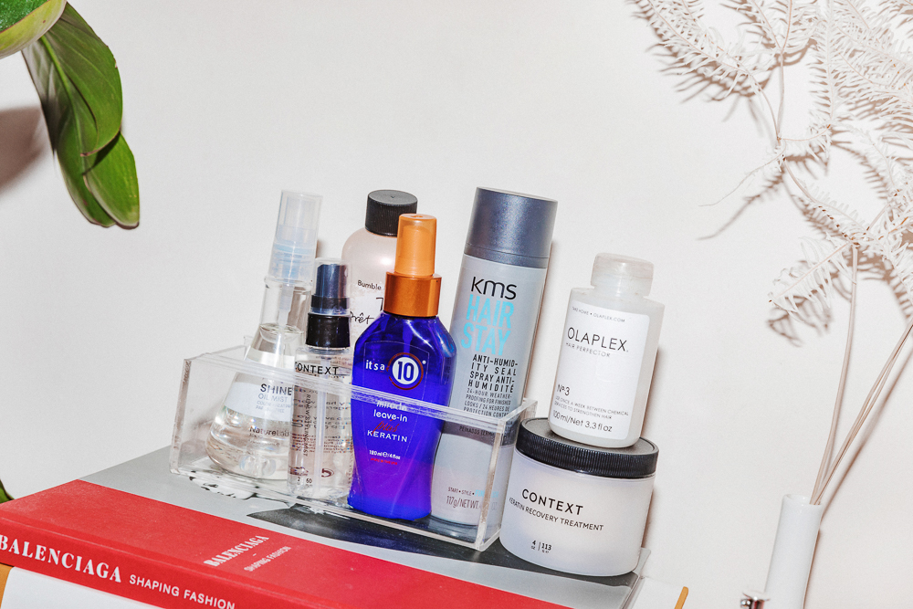 I bleached my hair in September of last year—obviously my haircare changed. Olaplex saves everyone's life. I really don't blow dry my hair because I know that I probably shouldn't be doing any sort of heat to it, but when I feel like I have to, or I sleep with wet hair, I just apply that. The finish is so nice, and your hair feels luscious after. On an everyday basis, when I don't have time to wash my hair or feel like I shouldn't, I use Bumble and Bumble Dry Shampoo Powder. I also have It's A 10 with Keratin for every-day use, too, which is great to make your hair instantly feel moisturized. I also have an oil mist from this brand called Nature Lab, which is from Japan. Everything's shaped like a flask or a chemistry thing. They're good for sheen and to make your hair have a silky texture. I work out pretty often, and I don't like the feeling of dirty hair but sometimes I feel like I just have to let it sit. It's good to let oils regenerate in your hair.