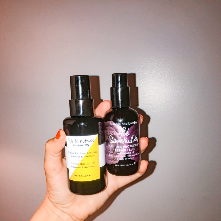 Next, I whip up a little magic potion of lotions that will set the tone for the moisturized sleekness to come. My dream is for my hair to feel like a silky orange kitten (I imagine he is named Creamsicle) who just looks this way because my carefree spirit sends energy of sunshine from my heart all the way up to my scalp and out into the ends of my golden waves. You know what I mean? Recipe is as follows: 2 pumps Bumble and Bumble Protective Repair Fluid and 1 pump of Sisley Precious Hair Oil. The $luxe$ combo checks the three major boxes for me: nutrition, shine and moisture.