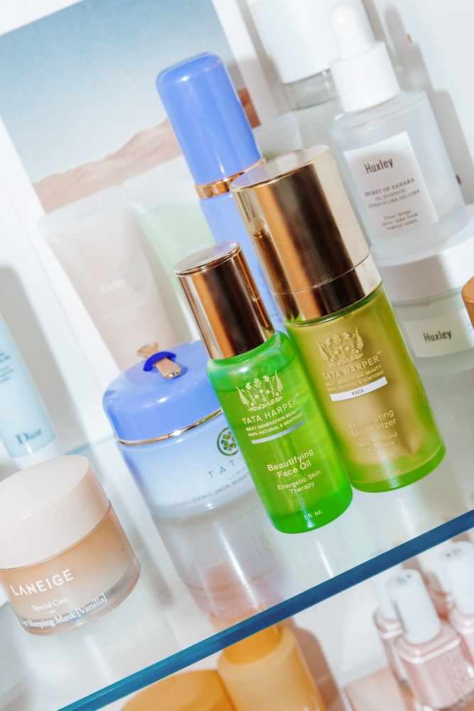 A huge part of my beauty routine is the fact that I’m moving a lot, and I sweat a lot. Being from the area of the world that I’m from, it’s all about the glow. So, I love oils—I always use an oil as a base instead of moisturizer. At the moment I’m obsessed with mixing this Tata Harper Beautifying Face Oil with her Illuminating Moisturizer as my base.