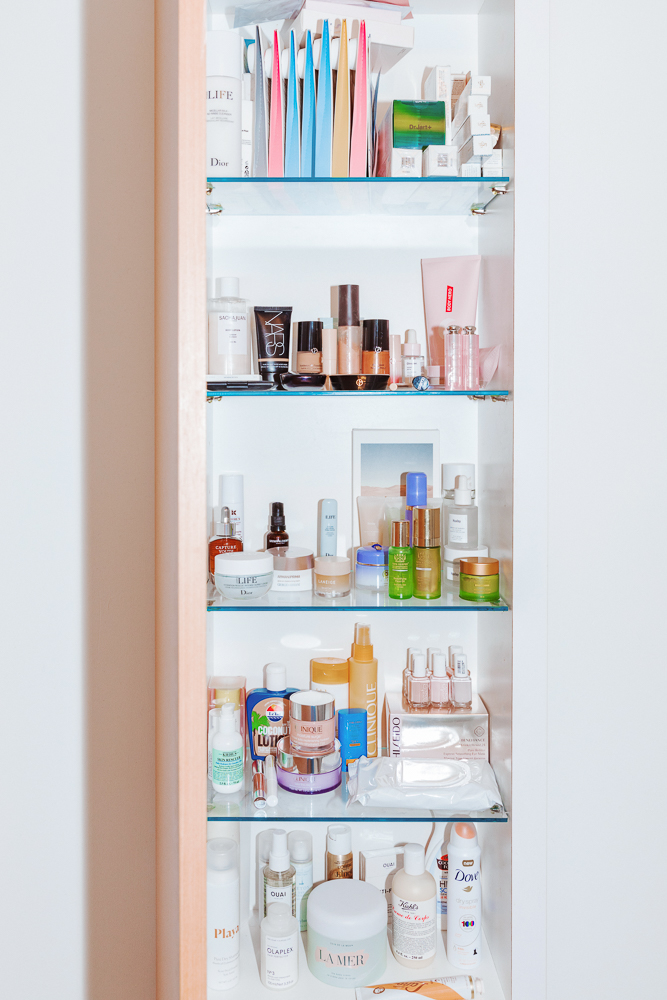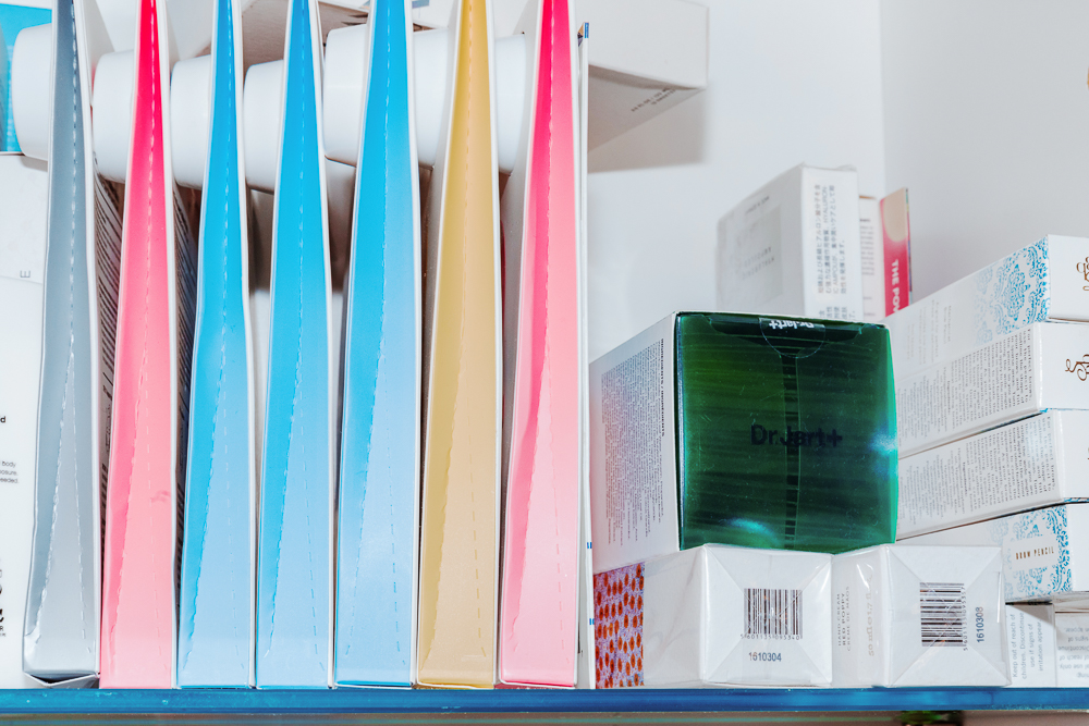 My face mask section is a mess, always. I love Huxley. Their masks always make my skin feel reset. The Glossier masks make me feel fun. There are a lot of Dr. Jart ones I like. My favorite lip masks are from KNC Beauty, and she’s just bought out some eye masks, which I want to try. I love these Shiseido Benefiance Eye Masks, they’re really good. And I love this brand, Erno Laszlo—they make really good masks, especially their black one. It’s so good.