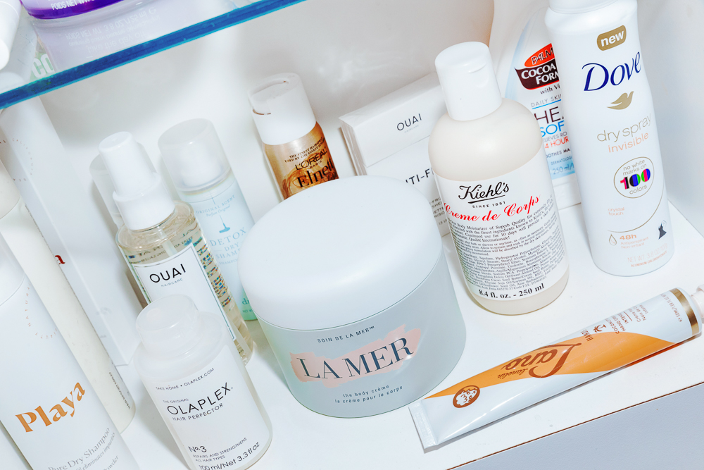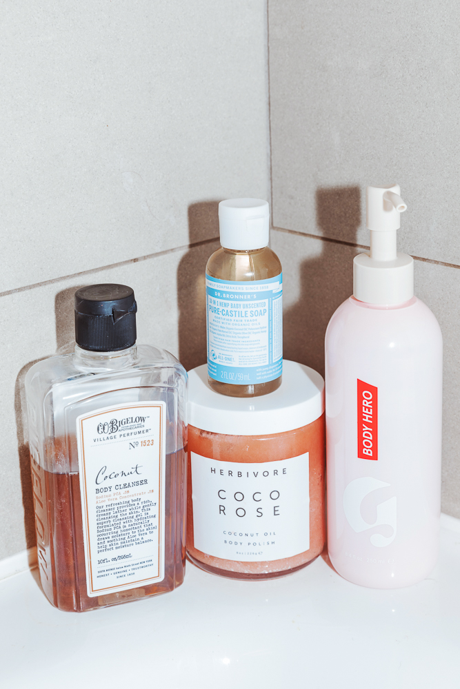 In the shower, I like this C.O. Bigelow Coconut Body Cleanser. Then I have Body Hero, Coco Rose from Herbivore for a scrub, and this Dr. Bronner’s one. La Mer Body Cream is good if you want to be bougie to your body. It’s so fucking good. Lanolips Hand Cream is amazing, and Dove has been my deodorant for years—I wear it when I work out and I never have BO. I try to take a shower after I work out. If I can come home I do, or if I can shower at work, absolutely.