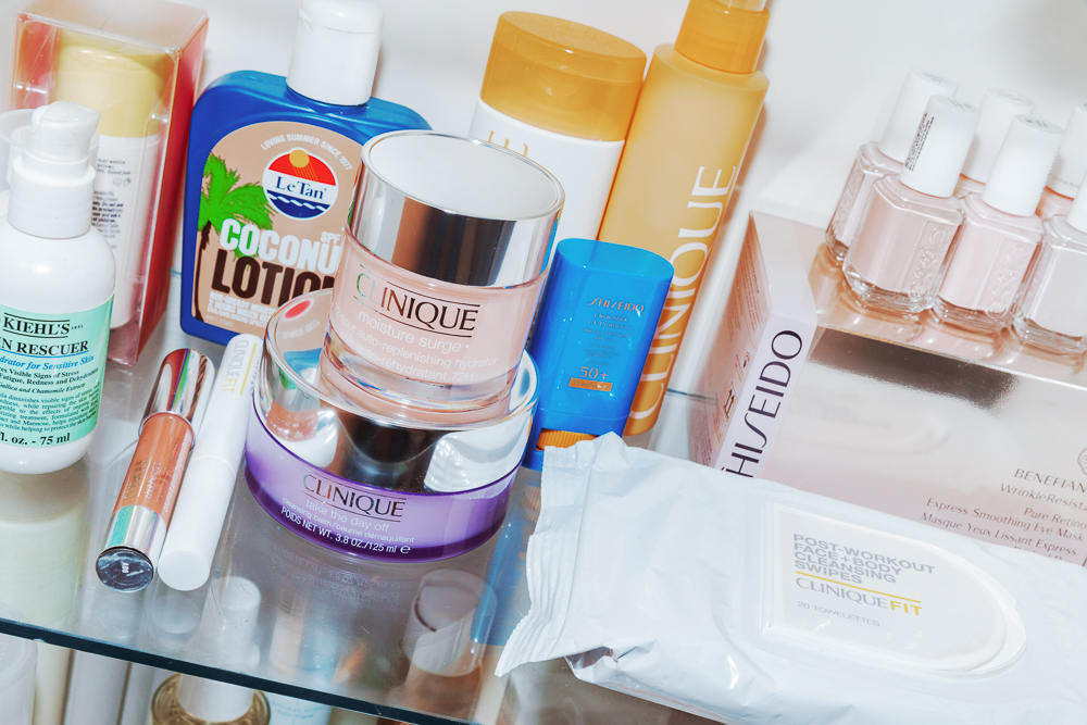 I don’t cleanse every time I work out, but I always have the Clinique Cleansing Wipes in my bag—those are really good. A lot of people react to cleansing wipes, but these smell really nice—I don’t want to smell like I just poured alcohol on my face, and they don’t make my face all tingly. Often I’m running from a class to a dinner or a meeting, so I can just wipe off with that. I also use this Panacea Skin Cleanser for when I’m washing my face. It’s really buttery—I’m pretty lucky my skin’s not reactive, because I love using that. I have a Dior Cleansing Milk that I like, and then I always moisturize with my oil. If I’ve been traveling a lot, I have some more intense hydrating products that I like. Moisture Surge by Clinique, and I’m obsessed with Giorgio Armani Prima Glow-On Moisturizing Balm and Dior Hydration Rescue. That’s the worst thing when you fly—you get so dehydrated. Even in a lot of places where there’s air conditioning, I always turn the air conditioning off in my hotel or my house. If I have a breakout, Skin Rescue from Kiehl’s is great. If my skin is reacting to something, that’s a big thing for me.