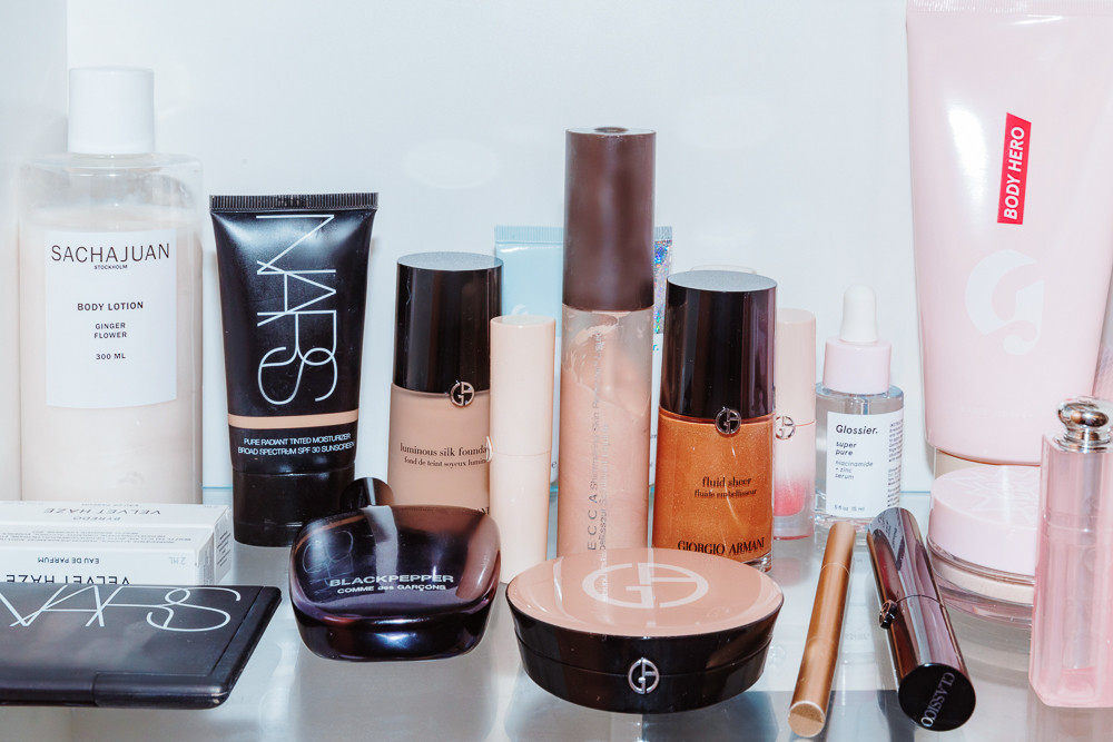 I love having a glow, so I love highlighters. I have the Becca Shimmering Skin Perfector in Champagne Pop, and then I have this Armani Fluid Sheer Bronzer that’s really great if you’re going out at night. Another bronzer I like is this Nars one, Laguna, or this other Armani one in Neo Nude. I love Glossier Haloscope, and I love Balm Dotcom. The coconut’s my favorite one—I just rage through it. Sometimes I use this Chubby Stick from Clinique in Heaping Hazelnut. I'm boring, but I just like glowy.