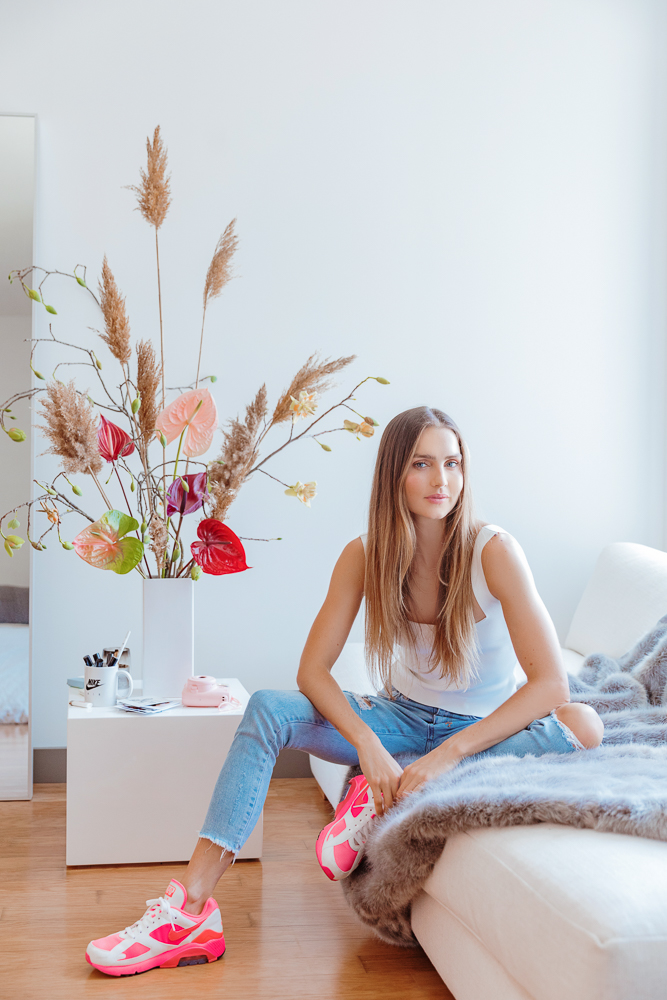 I have very long hair for working in fitness—it’s dangerous. When it's in a braid, it could take out an eyeball. My friend did my hair last time—I never used to color it, and then he put some blonde in it just for fun. His name is Reece Walker, and he’s in LA. Otherwise Ryan Pearl who lives here has done my hair before. I’m really low-maintenance with hair, but it’s important to me that my hair smells nice. I like the Kiehl’s Amino Acid Shampoo and Conditioner—that always makes it feel good. A lot of the time my hair will be super clean in the ponytail but I just need to freshen up in the roots, so it’s important to have a good dry shampoo. I like Drybar’s, or this new brand called Playa. I like that one a lot—it smells really good. Smell is a big thing for me. When I’m working out generally it’s in a high pony, or I love braids, but I can’t braid my own hair. I love it when I have like four braids—I’m lucky that I shoot with Nike a lot and I’ll generally always have braids done for that. It’s very rare that my hair is actually out. I probably wash it every two or three days. I just don’t sweat much.