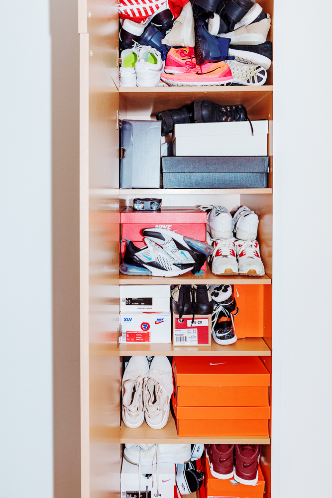 I have nice nails, except for my busted up boxing knuckle. This is just a regular Essie polish, but I do often like gel. I always have beige or nude colored nails—I say it’s bad and beige-y. I like to have my nails done because most of the time I can’t wear my jewelry when I’m training people. It still makes me feel pretty, and you obviously also have your hands on people, so I think it shows you’re clean. This one is called Spin The Bottle. I have someone paint them for me—I’m really bad at being patient. I can’t sit still. Me and my friend who’s also a trainer always go together, because we’re the same like, ‘I cannot sit still for the life of me to have it done.’ I have really long nail beds, so they’re naturally long. They’re never going to be like claws, because that’s not functional for jumping on a pullup bar, or touching people—I don’t want to scratch someone."