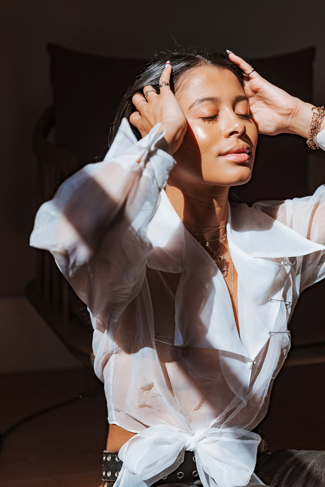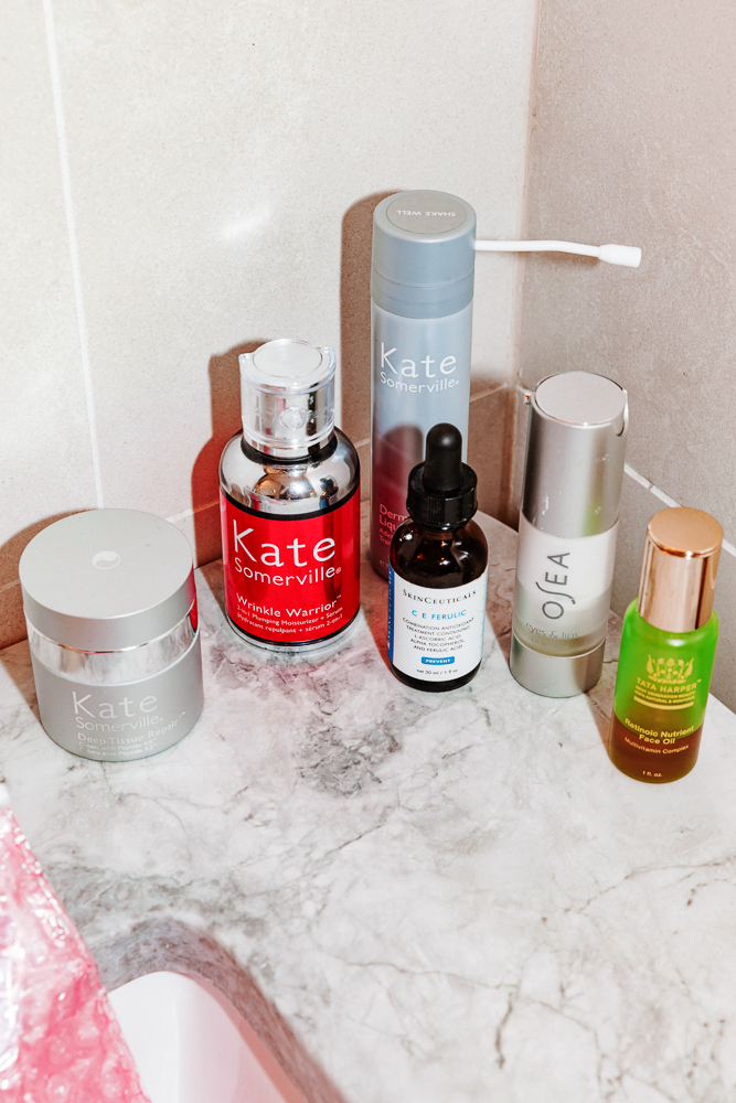 My skincare routine got started only two years ago. Now that I’m 30, I really need to start doing it. I just started using CE Ferulic and I feel like it’s transformed my face. My skin’s kind of dry, and LA is hot and dry, so my facialist gave me Wrinkle Warrior with hyaluronic acid. I use Kate Somerville DermalQuench Liquid Lift, Wrinkle Warrior, Deep Tissue Repair and the CE Ferulic day and night, and Osea Eyes and Lips. I also have Osea Hyaluronic Acid Serum, too. At night, I like to use Tata Harper’s Retanoic Nutrient Face Oil. I just feel like they all make me look more youthful and hydrated and bright.