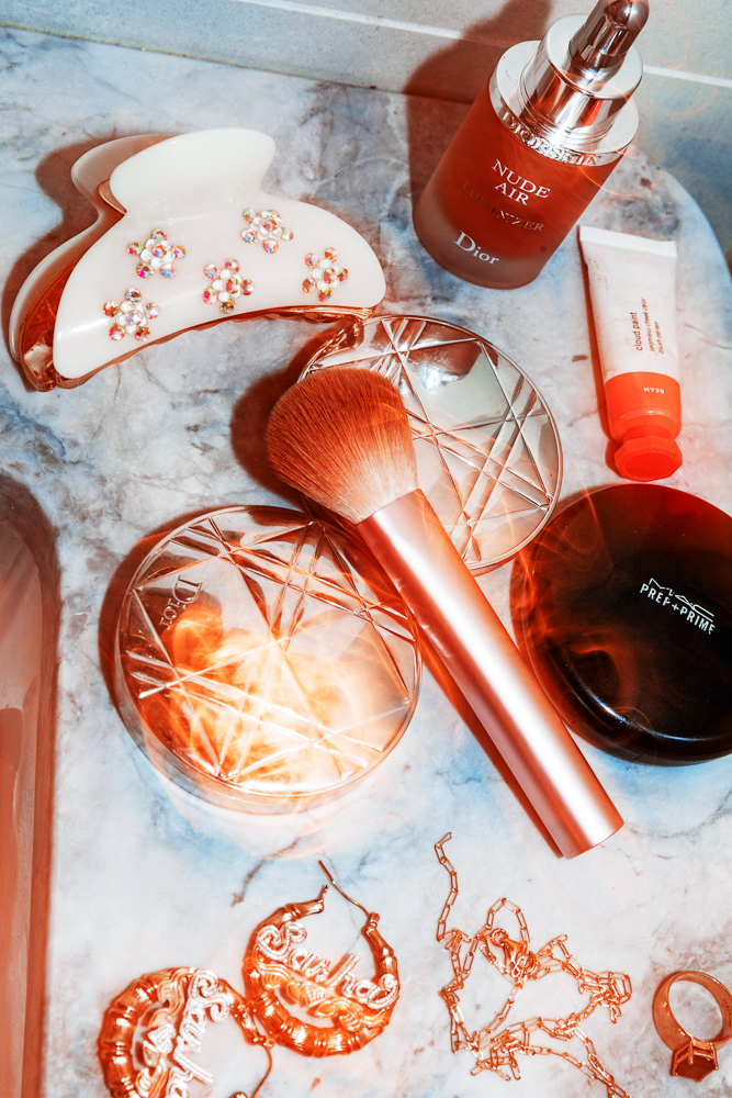 For foundation, I really love Armani Luminous Silk. I only use that when I really need to look nice. I don’t know if it’s in my head, but I’ve always felt like liquid foundation makes my pores look bigger. That’s why I like the powder foundation, it doesn’t do that to me. I really love Bobbi Brown Skin Weightless Powder Foundation because it looks really natural. I blend it everywhere. I get really oily, so I use MAC Finishing Powder on the corners of my nose, T-zone, and chin. I just started using the Nude Air Luminizer from Dior, and it is bomb. It’s so beautiful. Before I do that, I put some of the Dior Mineral Skin Bronzer on—just a little on the hollows of my cheeks. Then I put the Nude Luminizer on, and it’s so fun because it has little droppers. The Dior Luminizer is kind of like a bronzer, too.
