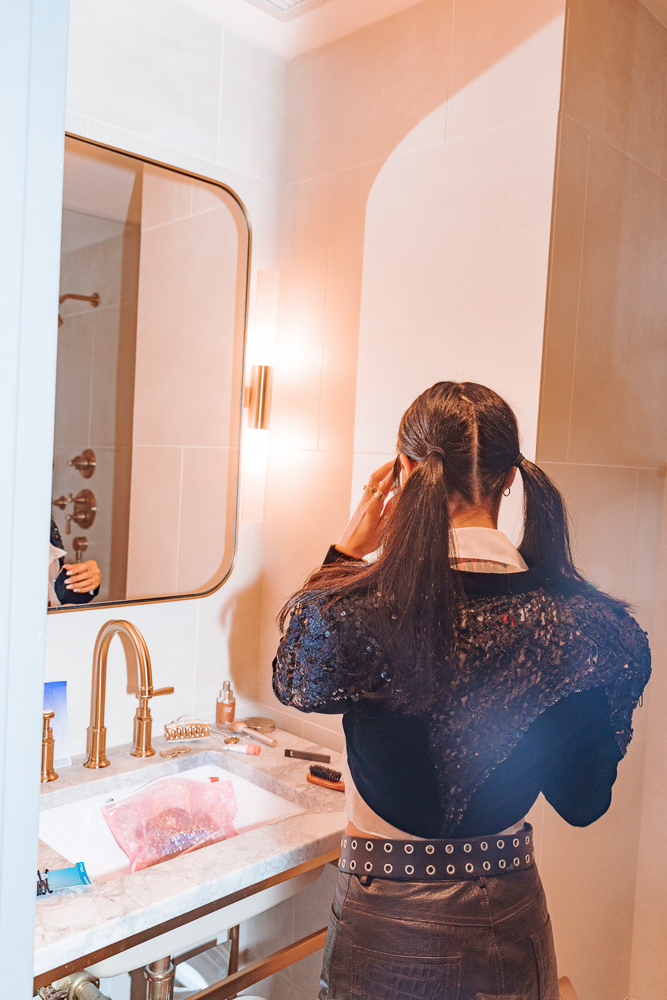 I get ready to go out like a tornado. It’s really a tornado—I try on a million outfits, and my house is always a disaster after. I’m always late, but I’m really not doing anything other than trying on a million outfits. I’m very simple when it comes to makeup—this is basically the most makeup I’ll wear, and this is like 10 minutes. I think some girls just have the face for doing all that eyeshadow and crazy stuff, and I just don’t think it looks right on me. Less is more for me—maybe also because my clothes are what’s poppin. My hair was bleached blonde, but now it’s all virgin hair. I grew it out like 2 years ago. Ever since I went back to black hair, I cut it super short—I was like, ‘This is my chance.' Then I got a keratin treatment because it was really short and my hair is naturally ringlet-y. Now I just decided that I’m going to grow out the Keratin and go back to curly. Nick Flores does my cut—he works at Sally Hershberger in LA, he’s my favorite. He also did my keratin—he does all the things I do to my hair. And I’ve been wearing pigtails a lot recently. I did that every day for six months like a year ago, and I just started doing it again because when my roots are growing out it’s just easier to slick it down and put it into 2 ponytails. I use Amika heat protectant and dry shampoo, if I ever have to do that. The gel that I use is the gel that I used to use when I was in high school, which is just a Walgreens brand. But the smell is so nostalgic—it’s yellow. I have a Moroccanoil curly hair cream that I use too, which is probably my favorite because it doesn’t make it too crispy but still really slicks it down. I use this brush, Evolve 511, that I got on Amazon. It’s better for slicking down than other bristles.