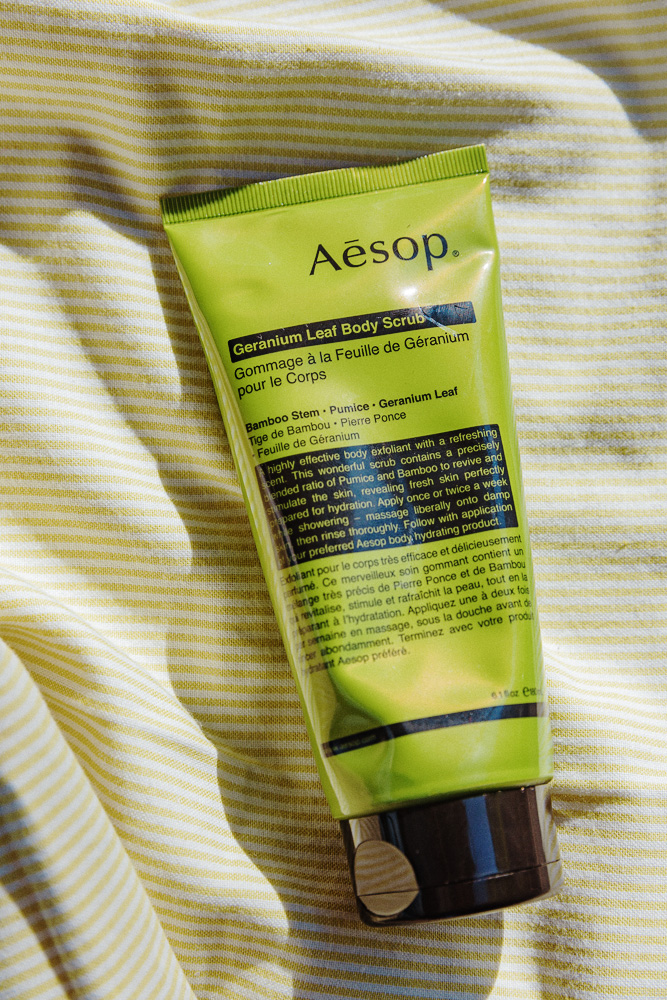 Now that your bathroom is all fogged up with that delicious, minty smell, it is the perfect time to scrub everything dead and dying and unholy off your corporeal self. (That’s dry skin, leftover sunscreen, and anything else using you as a host in the meantime.) Make a weekly event of it and spring for the fancier-than-it-needs-to-be Aesop tube. Afterwards, your body will sparkle like a brand new penny.