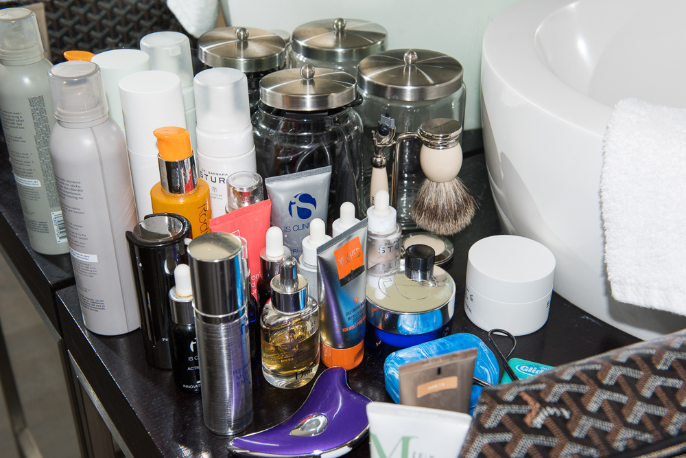 I guess you could call me a beauty junkie—I have a lot of beauty products. People DM me about the best facialist, the best cream I’ve tried, a mask I was wearing. When I wake up, I brush my teeth, have my coffee, and put sunscreen on before I leave. When I turned 40, I became really excessive about putting sunscreen on my face. I think it’s something people don’t really do, but here you have to do it, do it, do it. I think the guys in my gym locker room think I’m a weirdo because I take my Nurse Jamie Uplift Roller with me and do it after I work out. It’s a roller for your face that has tourmaline stones on it, but it looks a little like a purple dildo. I roll out my face, do a serum, a moisturizer, sometimes an under eye cream, and sometimes I’ll wear a tinted moisturizer. I curl my eyelashes almost every single day because it helps open up my eyes a little bit behind my glasses.