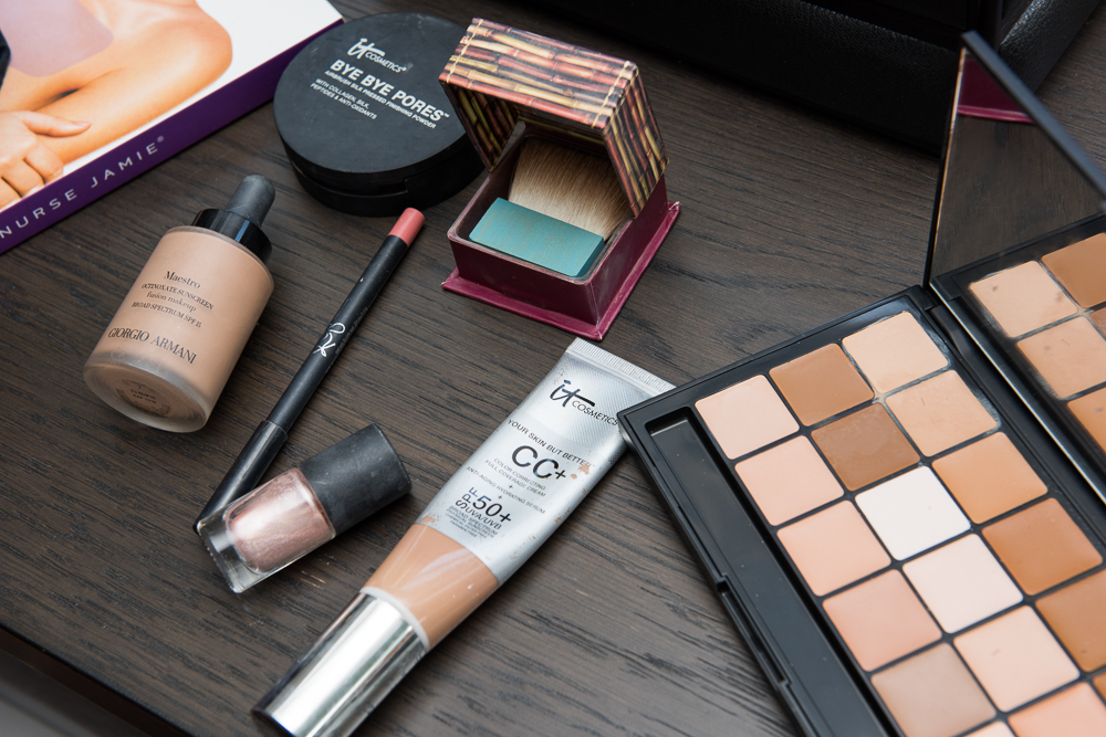The makeup I have is what I use if I do my own makeup for the red carpet. I actually like doing it, so I do it myself pretty often. I love my Hoola—love some bronzer. Giorgio Armani Maestro Sunscreen Makeup is to die for. I have a backstock of Starlit Liquid 02, which is a glitter pigment. I use IT Cosmetics CC Cream and Bye Bye Pores, which I love, and then I have this Bare Minerals Tinted Moisturizer for day to day. I also love a primer—this is a Korean one called MDoC BB Cream.