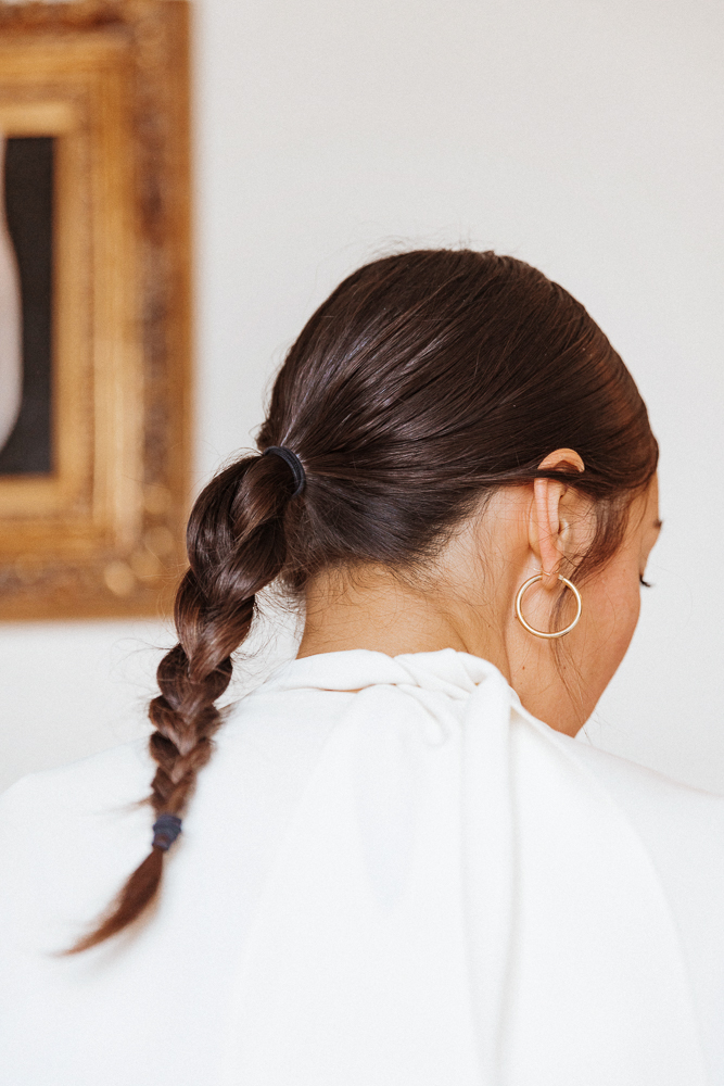 I don’t really get my hair cut. I’ve had every kind of haircut and style, but the most recent dramatic hair I had was several years ago, when I had a platinum bob for about a year or two. It was super cool, but ultimately I’m not really a salon girl. Besides, it was so expensive and I was frying my brain with chemicals. Since then, I have been growing it and just cutting little bits off. My typical daily hair routine is this: I part my hair down the middle when it’s wet, put in a Rahua Leave-in Treatment, flatten it out with a comb, put an elastic at the base of my hair, and then braid it. I don’t really touch it after it dries. If I’m going to wear it down, I don’t do anything. I only wash my hair once a week, and I don’t condition it. AG Balance is really good. I have really fine hair, or thin—I think it’s fine and thin. If I’m wearing it down, I wash it but don’t condition it because I like the natural texture of my hair, which is a little bit wavy. When I wear it down I don’t want it in my face, so it’s always tucked behind my ear. If my hair’s looking very flat, I use Lavett & Chin Sea Salt Texturizing Mist on the bottoms, and kind of scrunch to bring out the natural wave.