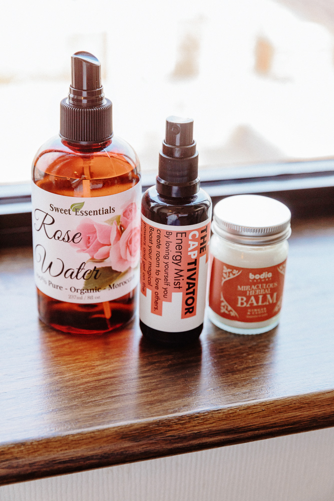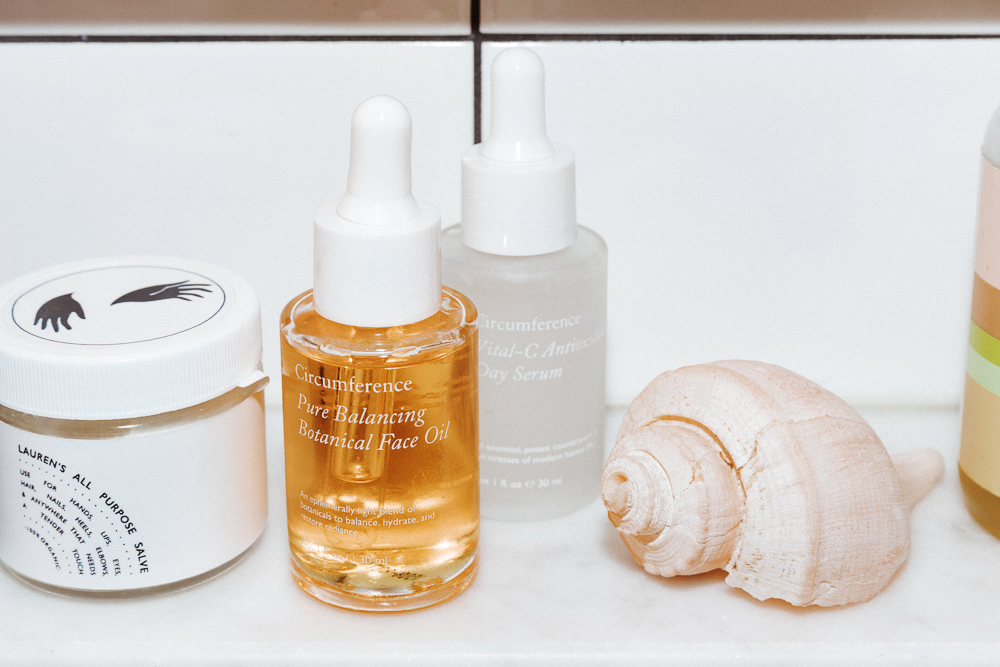 My skincare is just a few steps and I try to use natural products. In the morning I wake up and splash my face with cold water. I don’t wash it with soap because I think our body knows what’s best, and the less we do the more it manages its own oil production. I’ve been using this Circumference Vital C Antioxidant Day Serum—I don’t know if it’s doing anything—I just started using it about a month ago. I really like their Pure Balancing Botanica Face Oil. I do both—I spray with rose water, just the cheap, basic one from Sweet Essentials, then apply the vitamin C serum, then dab on like two drops of the face oil and do a kind of face massage with that. At night, if I’m wearing makeup, I’ll use coconut oil to remove all my makeup. I have this Eye Bright Makeup Remover and Treatment Oil from Farmaesthetics that I really like. It’s gentle and doesn’t irritate the eye—it’s also easier to travel with than a giant tub of coconut oil.