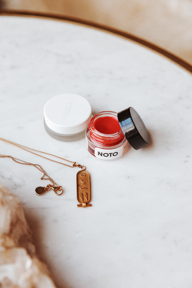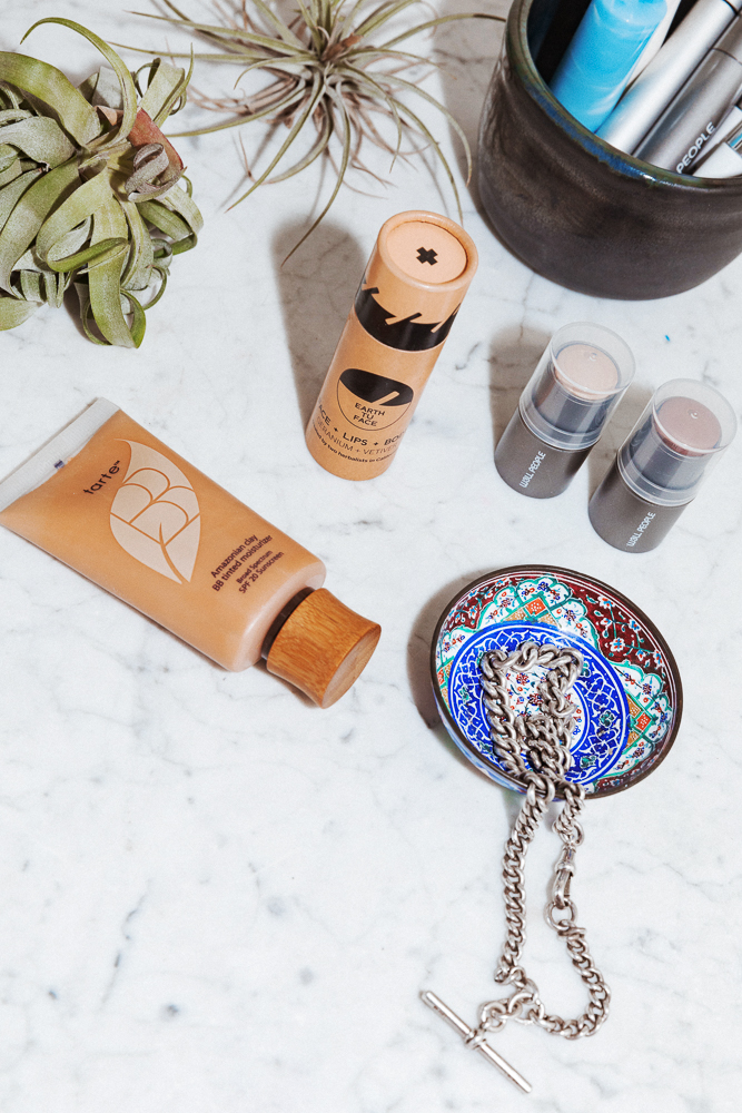 RMS’s Living Luminizer is like my favorite product of all time. It feels good, it’s easy to put on, and I like the highlight on my cheekbones or the lids of my eyes. I really like this Noto Multi Benne Stain—it’s just a red cheek stain. It’s funny because I never really liked blush, but recently, I don’t know! I’ve been interested in a healthy rouge on the tops of my cheeks, so that’s been fun to play with. I don’t really use concealer, but sometimes I use this Tarte Amazonian Clay BB Tinted Moisturizer, which has a little bit of sunscreen in it. It’s nice when I have a zit or something because it goes on sheer. I love that it leaves a dewy finish, and it blends easily.