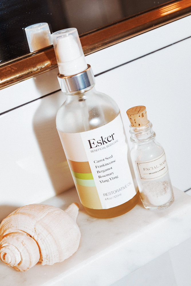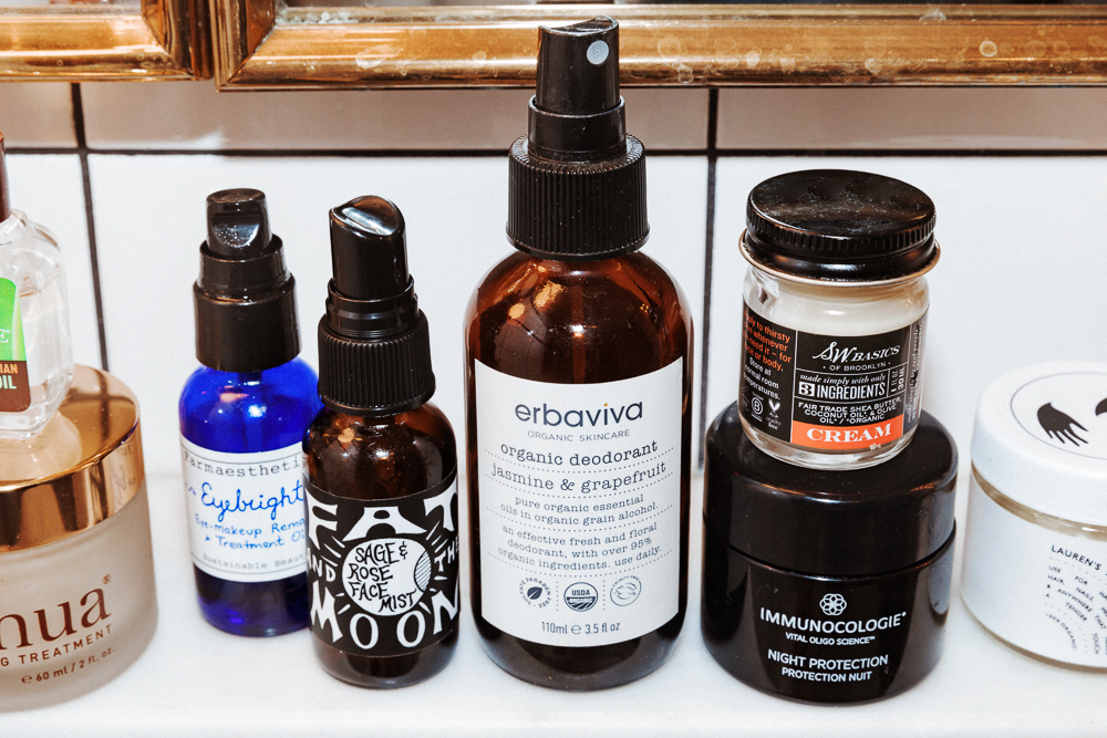 I use this Erbaviva Organic Deodorant, which I really like because I’ve tried a lot of natural deodorants and this one actually works. I’ve been playing around with different body oils I can use after the shower, and I’ve found that the most effective way to apply them is to not towel off, and to apply a small amount. Because your skin is wet, it blends easier. I really like Esker because it’s an all-natural body care oil, but it also has specific antioxidants to help reduce inflammation. I also really like Lauren’s All-Purpose. My hands get really dry—I just have dry skin in general, so I have to moisturize every single day. My hands and feet get really dry and cracked, so I use Lauren’s at night for that. I’ll sort of lube up my feet and put on socks, and sleep with them if it’s really bad. The smell is great—I think there’s lavender, peppermint, and patchouli in it. It kind of has that ritualistic experience of putting it on, but it’s a blend of lots of oils—shea butter, coconut oil, jojoba, hemp oil, blah blah. It’s very moisturizing but can be greasy.