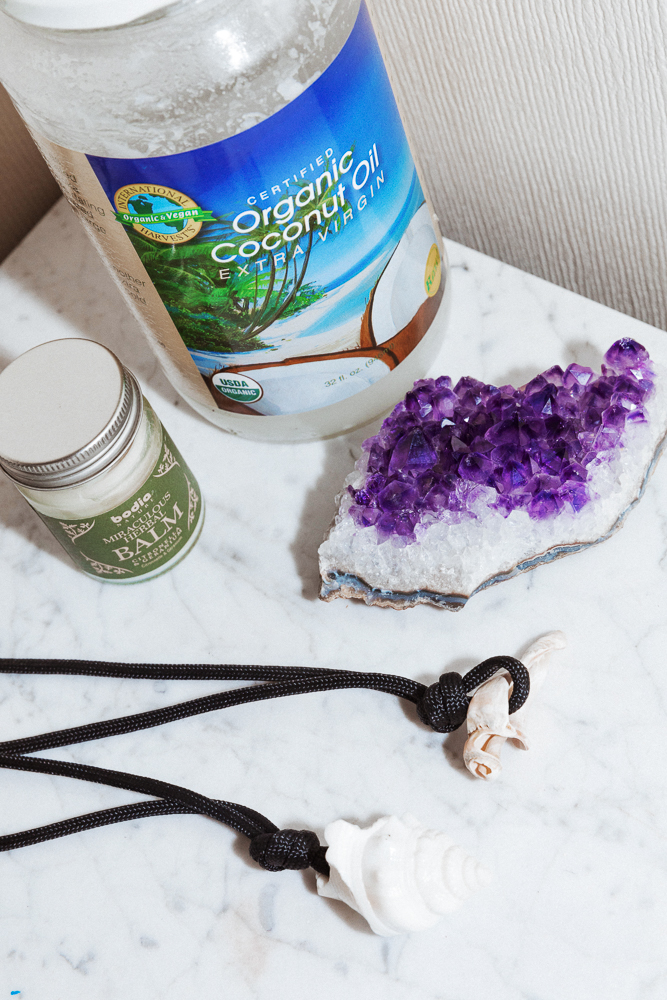 My favorite thing to use on my face because my skin gets so dry is Immunocologie Night Protection Cream. Obviously it’s meant for night-time, and it’s really good in the winter. I use it when I’m traveling on planes—I spray my face with the rose mist first, and apply a pretty good amount of the cream to my whole face. I find that it holds the moisture close to my skin. I don’t really cleanse at night—I use warm water, and if I’m feeling particularly dirty I’ll use coconut oil to cleanse. I exfoliate my face in the shower every other day with a washcloth, hard. I also dry brush. I have two—one for my face and one for my body. It’s actually pretty harsh, but it brings the blood to the skin’s surface and also flushes toxins. I also exfoliate with mitts that I just got from Whole Foods every other day. I feel like that does a lot of the work that a product would do, but I’m just doing it manually.