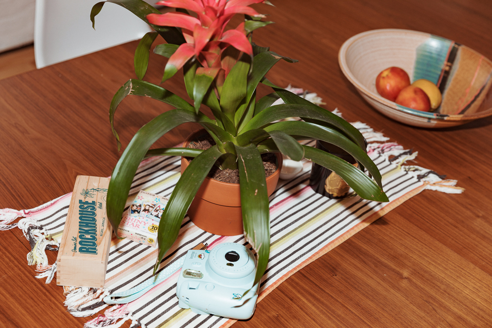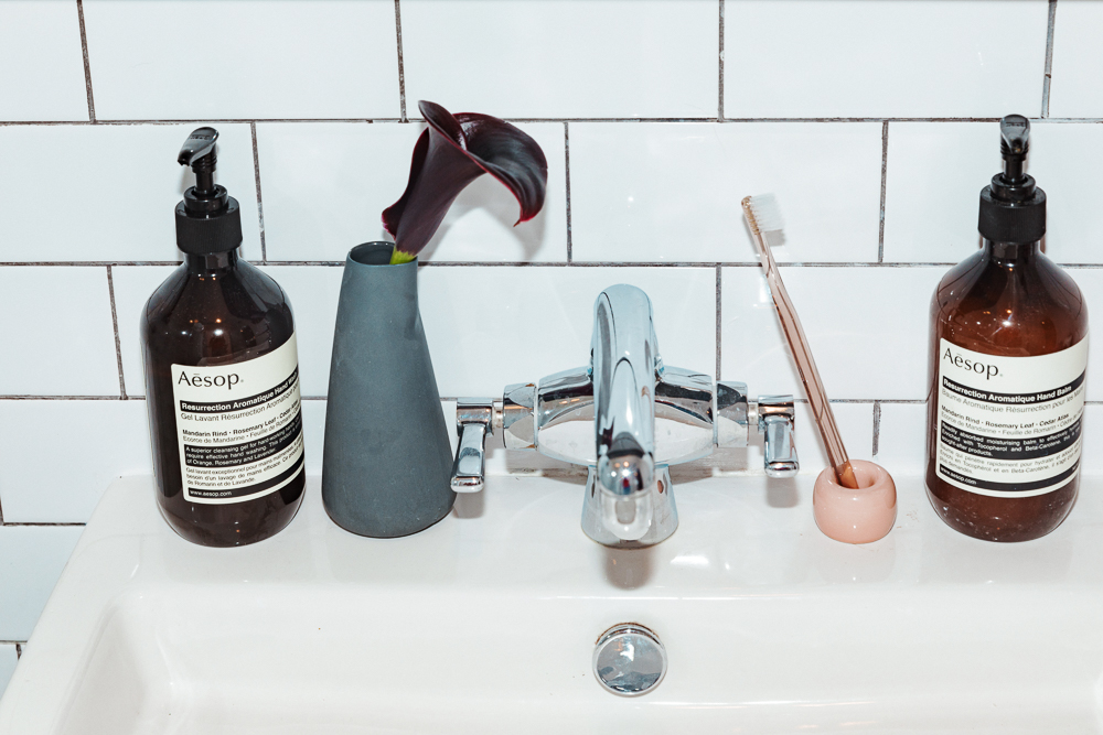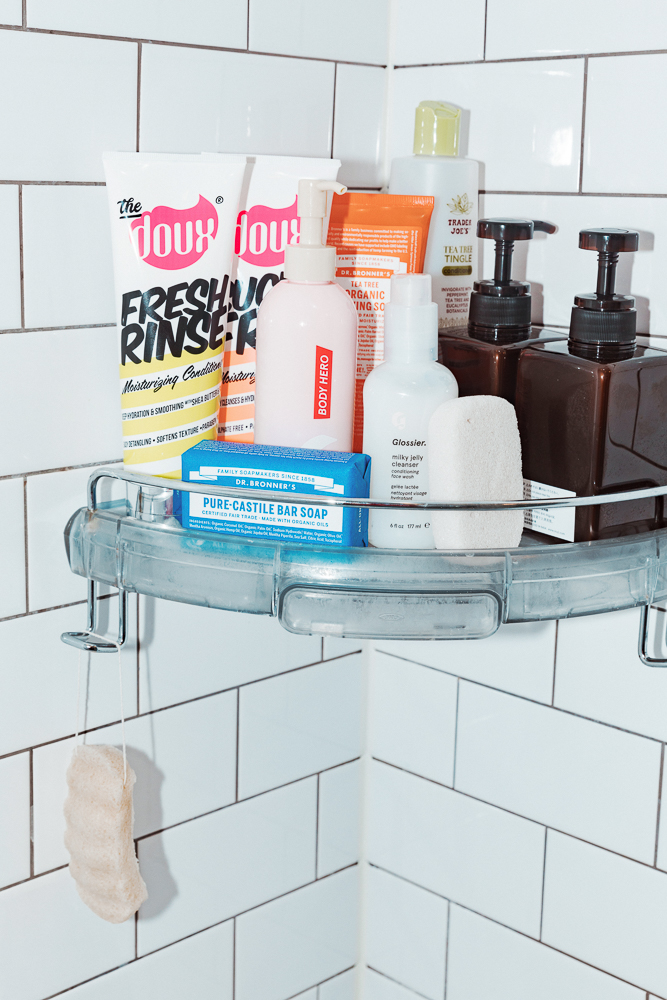 I just started experimenting with hair color. It was blonde-ish, and then I decided I wanted it pink, and now it’s sort of rose gold. My friend Maayan Zilberman and I spend a lot of time talking about which potions and mixtures work for curly hair, and I finally got the right combination of products. I’ve been doing a lot of island hair, but it’s blown out right now—I use a paddle brush, and then a flat iron. It’s the only thing I know how to do on myself. Dailey at H2 Salon in Bed Stuy does my color and cut, and Lorraine does my blowouts. I use this Joico Color Balance Blue Shampoo to tone it, maybe once a week. If I wash otherwise I’m using Mane ’n Tail or whatever, but I put it in Muji containers because it makes me feel a little fancier. I use the Doux Fresh Rinse, which is great for curly hair, and tea tree oil for my scalp. Body Hero smells amazing, and it’s a good oil that leaves my skin moisturized.