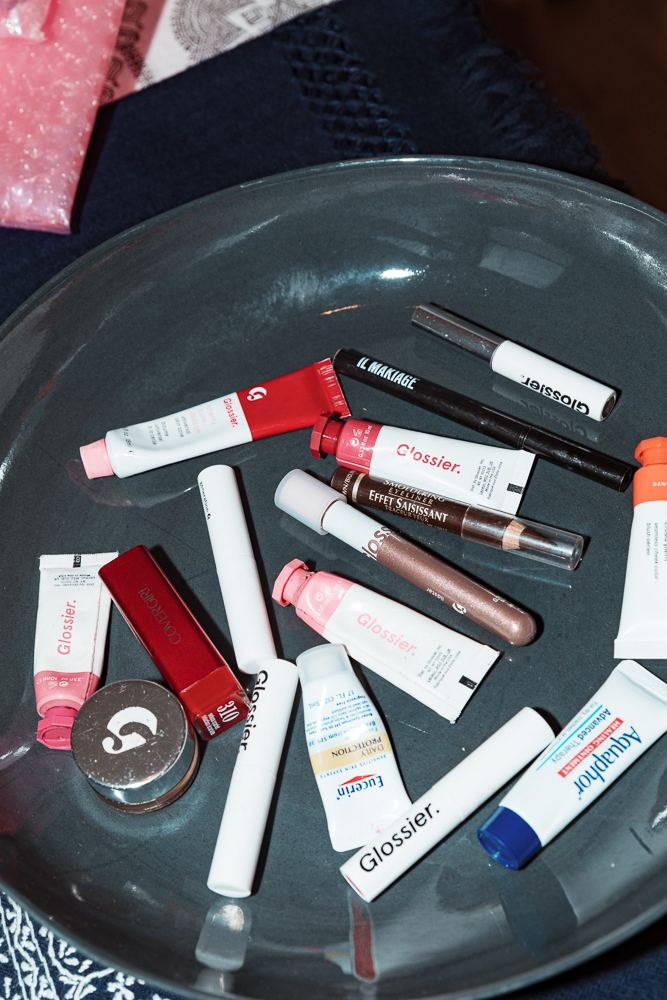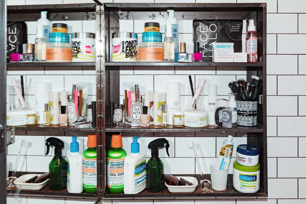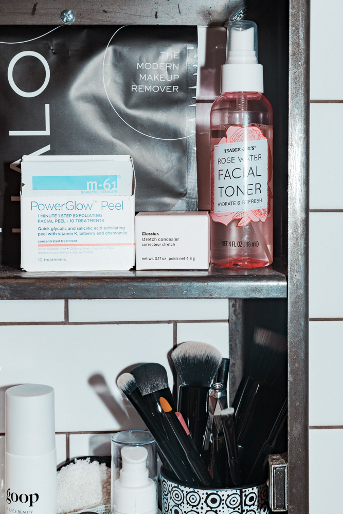 At the end of the night, I take off my makeup, especially the eye stuff. Basically the only look I do is a waterline, and I hate when I wake up in the morning and it’s still there. The Face Halo does a really good job of getting everything off, and I can just wash them in the laundry. I really like the Milky Jelly cleanser and Cetaphil—I switch between the two. This Renaissance Cleansing Gel from Oskia London is also quite good. I love me some Trader Joe’s—they have a really good rose water facial toner. And then I do the Power Glow Peel from M-61, which feels like a good base. I like to moisturize a lot, and I use a lot of Aquaphor because I have really chapped lips. I love this French Girl Under Eye Oil—I usually keep it on my desk at work. Anything ‘French girl’ I’m like, ‘Ooh, it must work.’ I really like the Goop Revitalizing Moisturizer. Honestly it was gifted to me, but I would repurchase it. I’m like the person for whom packaging was invented, so if it has a good package, I’ll probably get it. And I use this Linné Smooth Body Balm on my face—I don’t know if I’m supposed to be doing this, I might get yelled at by my dermatologist! Dr. Rita Linkner is my dermatologist for everything. If I’ve had a really fun night then yes, there’s food happening. And then I like to watch Portlandia. On my computer, no matter what time, to wind it down—it’s so good!”