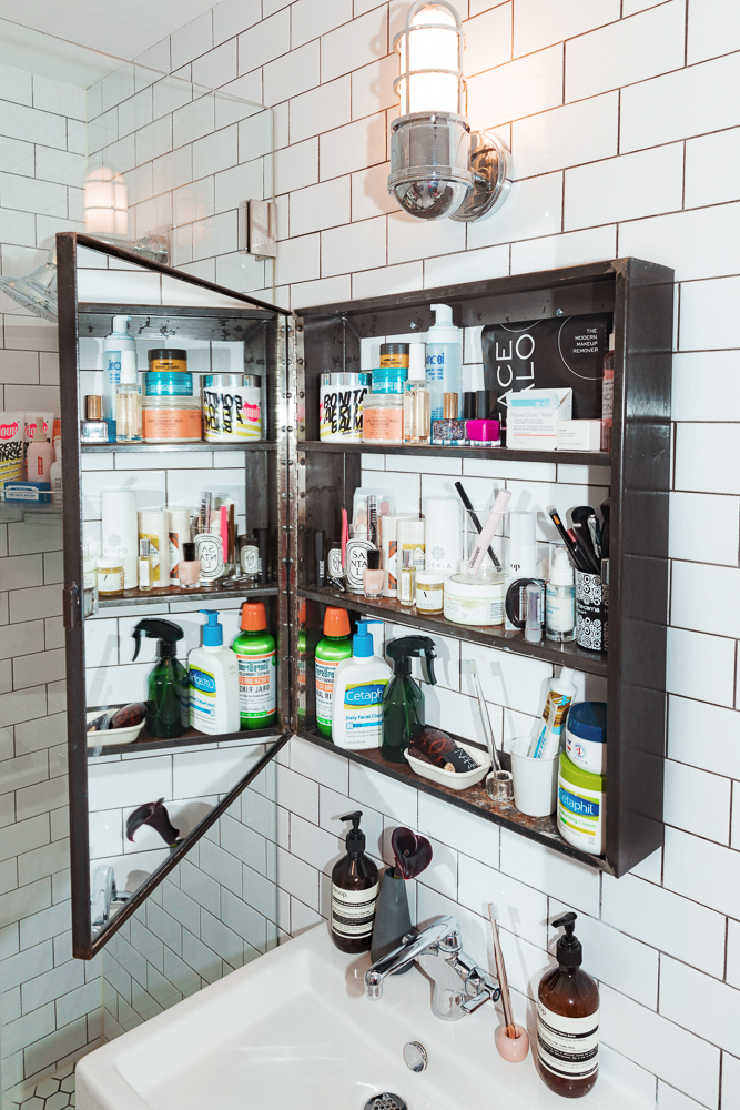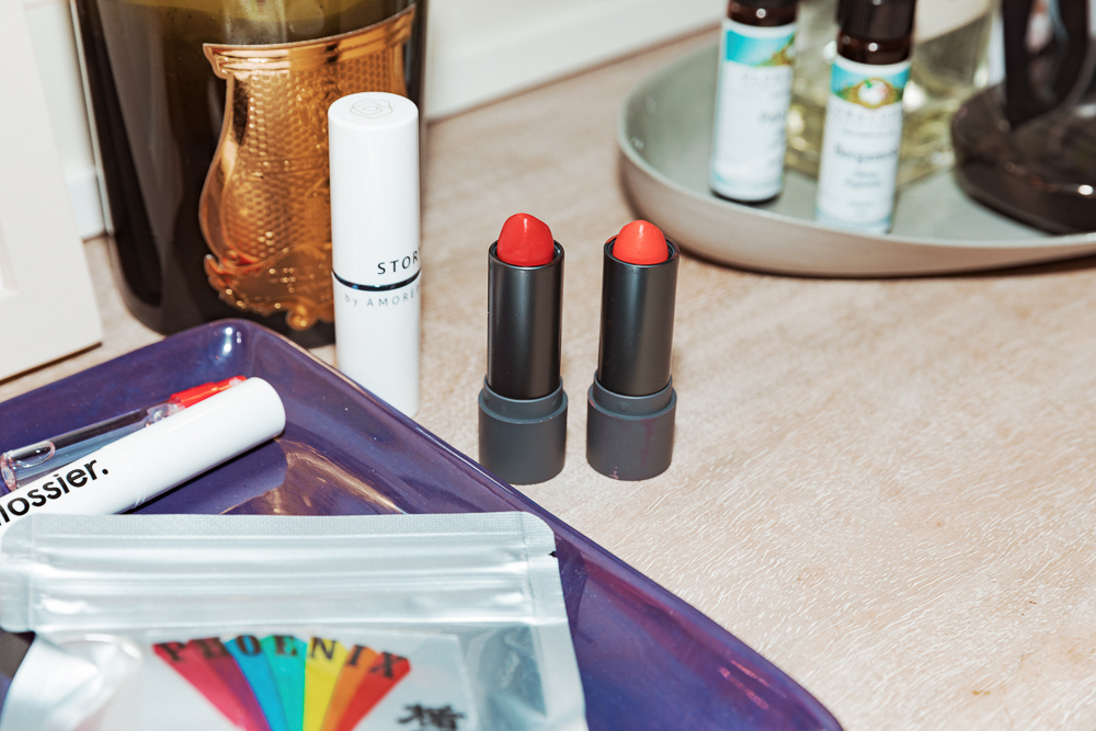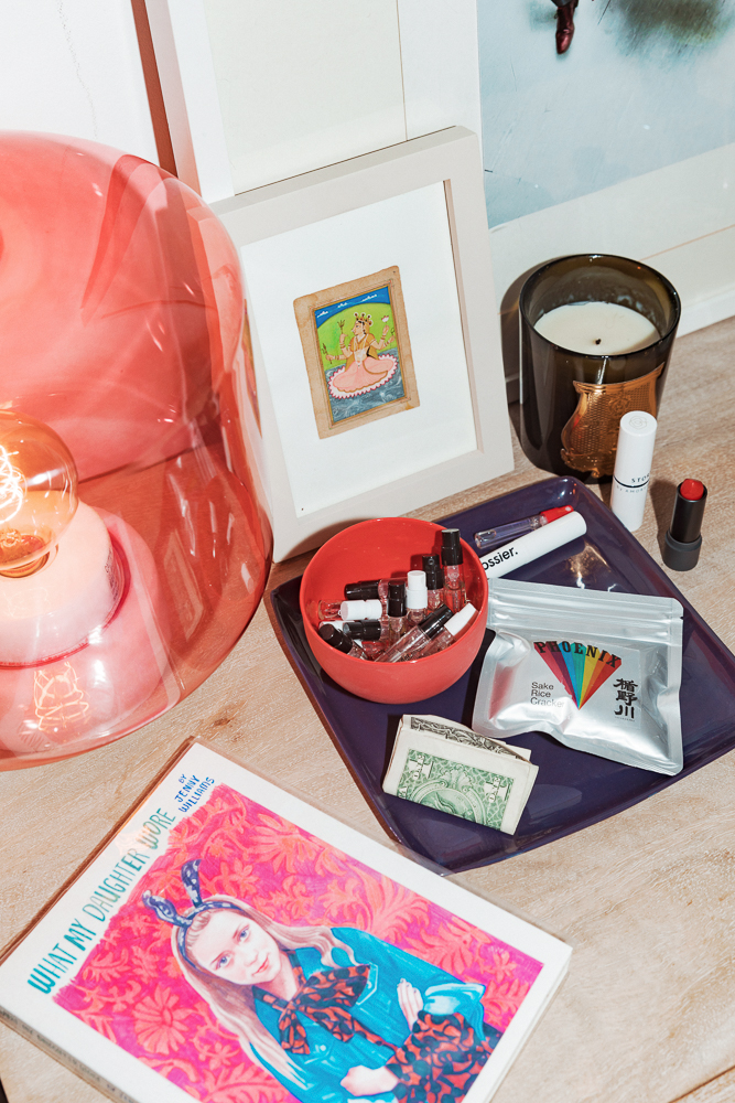 I don’t wear a lot of makeup because I’m not good at it, but I think I know what looks good on me. Lining my waterline gives me a different eye shape—it makes me feel a little more feline, and a little sexier. It might be a function of me never wearing makeup, but when I do it people are like, ‘Oh my god, did you just change?’ I’m still wearing the same dirty jeans, but I put on eyeliner. I got this Il Makiage black liner, which is good, and it’s very, very sharp. I use that, or I use a super cheapy-choppy one—L’Oréal Voluminous Smoldering Eyeliner is the best. I use the Glossier mascara because it makes my lashes look long, and I have very wimpy lashes. The only other thing I do consistently is fill in my mangy, patchy brows with a pencil from Benefit—I try to fill them in a little bit, and then I brush them up. I use the Stretch Concealer under my eyes and on my spots, when I have them. Then I’ll do Olio e Osso in No. 4 on the apples of my cheeks, or I’ll use Cloud Paint. I use Gen G for lipstick—I have all of them. I use a lot of Glossier products, but my kids steal them! They have a lot of fun with it, but I’m missing my Haloscope. Where the hell is it? I’m sure one of them has it. I do wear a red lip, and here’s a really good one—it’s CoverGirl Seduce Scarlet 310. It’s sort of creamy, and it was $8.79, so that’s the right price. We were on this impromptu crawl in Red Hook, and we ended up at this place Sunny’s and I was dancing, and I was like, ‘Wait! I need to put on a lipstick!’ So I went out and bought it.