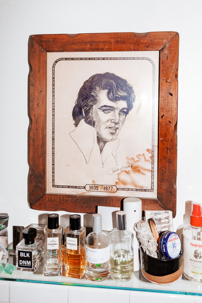 Aside from my essential oils and wearing sunscreen, I don’t do a ton. Sometimes I’ll use baking soda as a natural face scrub. I mix it with a little coconut oil–I only use coconut oil now, to wash my face or remove makeup. And I love doing a honey scrub. In the summertime at the farmer’s market there’s a lavender vendor, so I’ll do honey with lavender beads and some coffee grounds as a full body scrub. I’m a big advocate for like working from the inside out—drink a lot of water, drink a lot of coffee. I think for women, probiotics are really good. I do have some sun damage, so I wish I had been better about it as a teenager, but like… what are you gonna do, you only live once! [Laughs] You know, dance. Make yourself happy in all the ways possible. Get a crazy dog. It’ll keep you young.