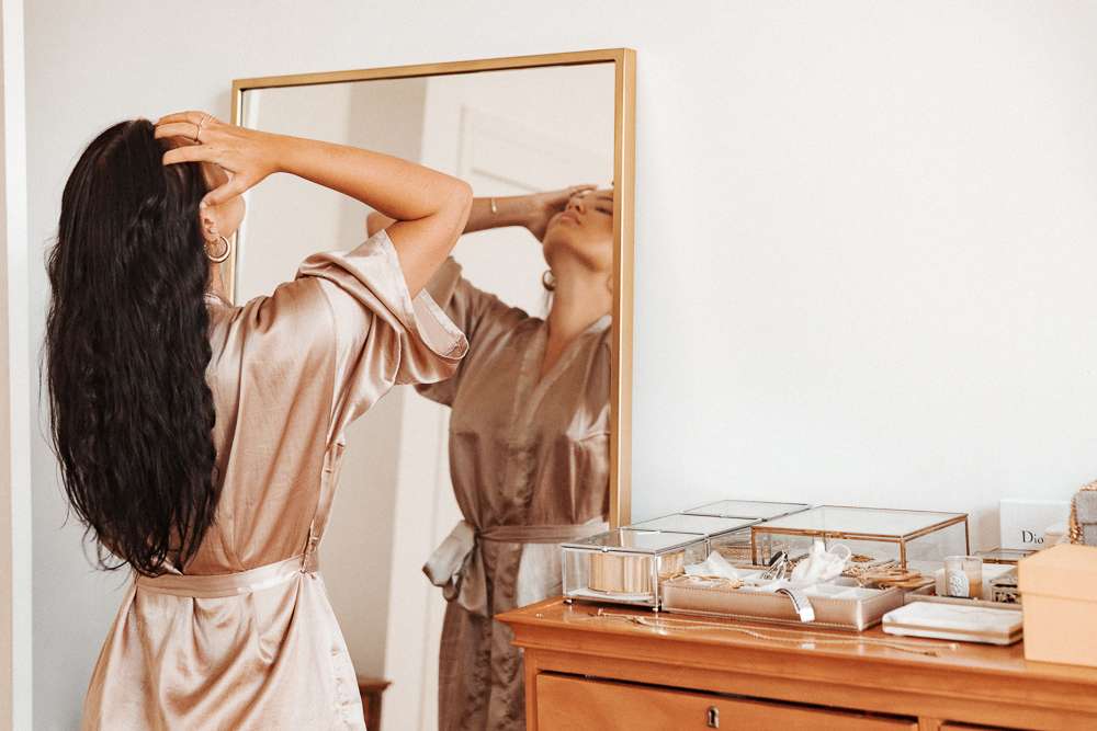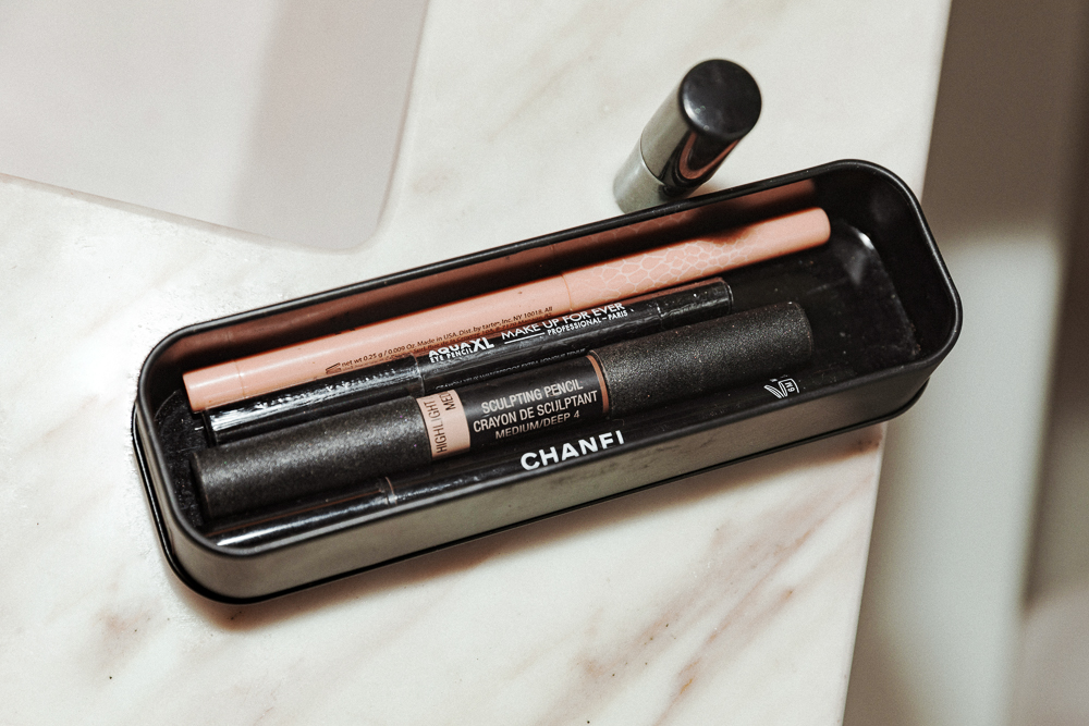 I wear mascara, but not a lot, and I don’t curl my lashes. Right now I use Tracy Murphy Lash Star because I love the two sides. There’s a small brush for the lower lashes and then a larger curved brush for the top lashes—she really kind of nailed the science on that. Chanel makes this lash primer, and it is a game changer. You apply the primer first, and then you put on the mascara, and it makes the biggest difference in the world. It almost looks like false eyelashes. When it comes to lipsticks, I love the nude ones. Bobbi Brown kills it—there are so many nudes to play with and their creamy sticks are so creamy. Right now I’m wearing the Fenty gloss. How the hell do you only make one color and it looks good on everybody? The tiny glitter in it makes such a difference. My day-to-day eyeshadow is just a nude. Again, Bobbi Brown has really awesome nude shades. I like the one called the Nude on Nude eye palette—they’re subtle colors. I just do one shade all over. I don’t really do anything to my eyebrows—I get strays, and I just pluck those, and I have like a $4 or $5 eyebrow gel from the drugstore. Even if I don’t fill them in at all, I will gel them.