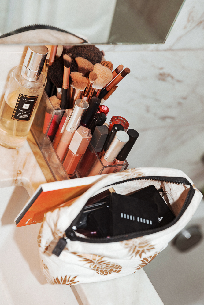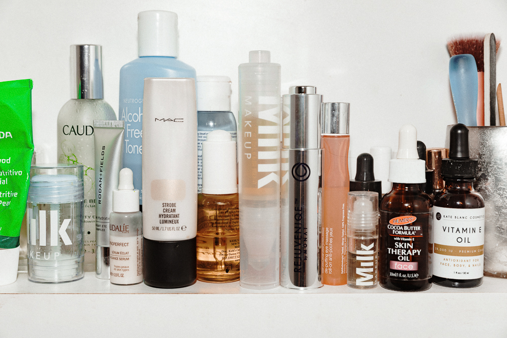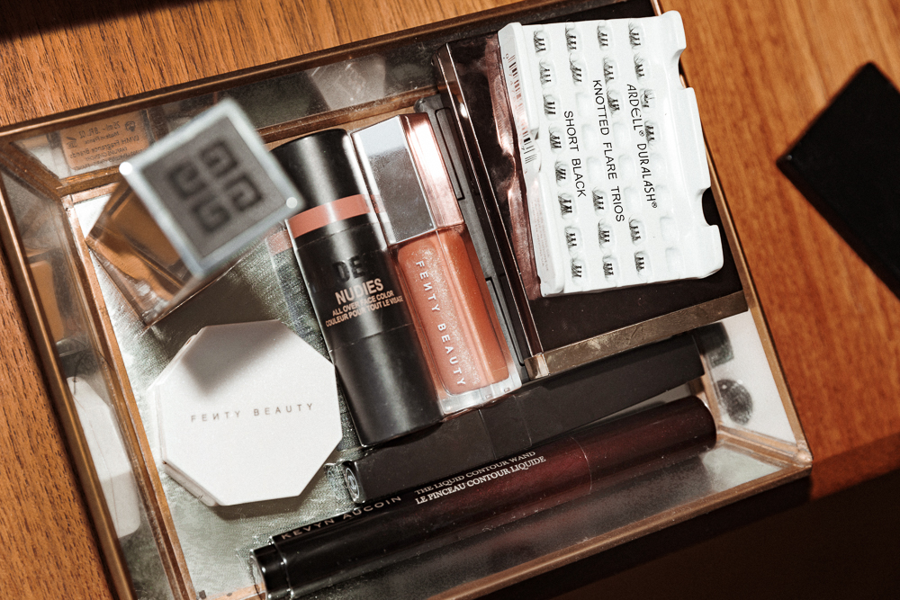 I always change my makeup—I think it’s from doing photoshoots all the time. You’re constantly exposed to new products, so then you’re like, ‘Ooh, I should get this.’ Also my makeup changes depending on my confidence levels. Some days I will wear no makeup, just a moisturizer, some highlight, lip gloss, and call it a day. Other days I want to get more dolled up, and I’ll do the whole thing with foundation and concealer. It depends. There’s a Laura Mercier concealer duo, and the reason I love it is because you can take a yellow base and a pink base and mix them together—I use SC5. My foundation is always changing. I select it based on how well the color matches, I don’t care so much about the brand. At the moment I’m using a Givenchy one in Elegant Ginger. I use a mattifying powder from Nars—Translucent Crystal Light Reflecting Setting Powder—and it has this ever-so-slight pearly shine. I carry that with me everywhere with a brush, and I won’t even look [when I apply it]. Something I’m really obsessed with is the Fenty Highlighter—it’s called Hu$tla Baby. I put that on all the time. I love highlighter—I prefer cream ones, but the Fenty one is so fine that it doesn’t feel like a powder. I also love a good contour. There’s this Kevyn Aucoin stick that you pump, and it’s so convenient for traveling. You don’t need a brush, you’re not going to mess up your fingers or whatever. Another thing I have is this blush from Nudestix. On one side there’s a little brush, on the other side it’s a stick creamy blush thing. I use it for my lips, cheeks, and eyes. I’m also obsessed with Shade and Illuminate from Tom Ford—who isn’t? It’s expensive, but worth it.