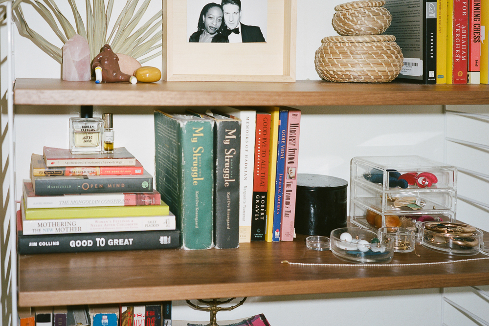 This is probably the most makeup you’ll see me wear—maybe I'd do a little bit more on the eyes. I do Kjaer Weis for foundation in Flawless. I love the packaging—that’s where I fell first—but they actually have the largest assortment of colors for black and brown girls out there. My friend Katey Denno is a makeup artist, and she taught me this trick of taking a really small brush, and then taking the foundation and just going in for the marks, like a concealer. It’s been such a big game-changer. Because this color matches so well, I don’t even put it all over my face. The foundation is really smooth and creamy, and my skin just absorbs it. And then I use their blush too—in Joyful. They’re one of the lowest toxicity brands out there, and you just buy one of the boxes and keep refilling your color. Also for cheeks, I got introduced to Rituel de Filles, which is another non-toxic line. I have it on my cheeks and lips and eyes right now. Sometimes I’ll blend in a little bit of Beauty Counter's Tint Skin in Mocha under my eyes if I don’t feel like using the Kjaer foundation. I don’t use setting powder or anything like that. And then I really like W3ll People, another non-toxic line, for their mascara.