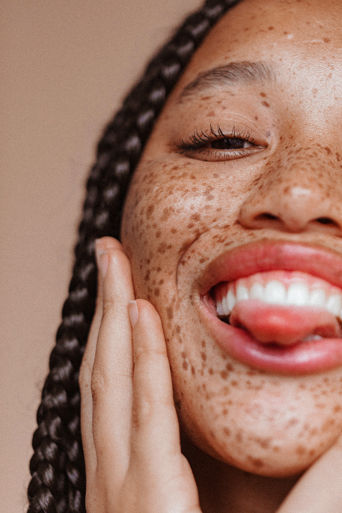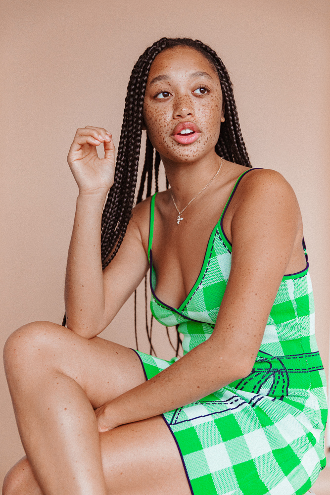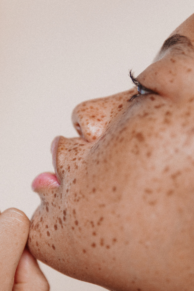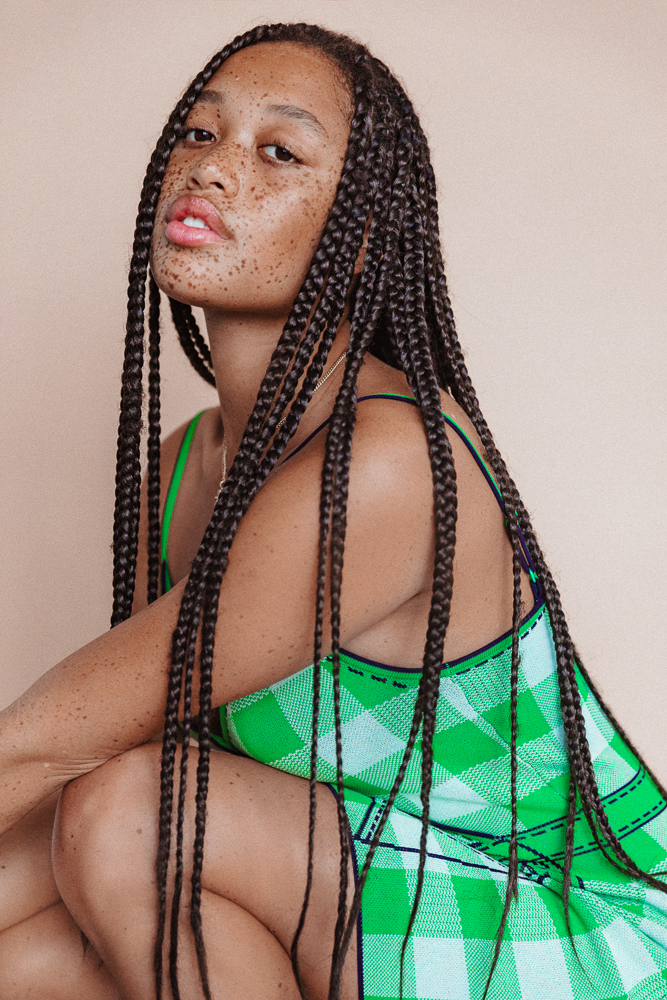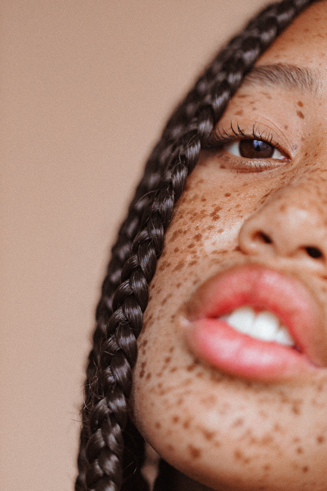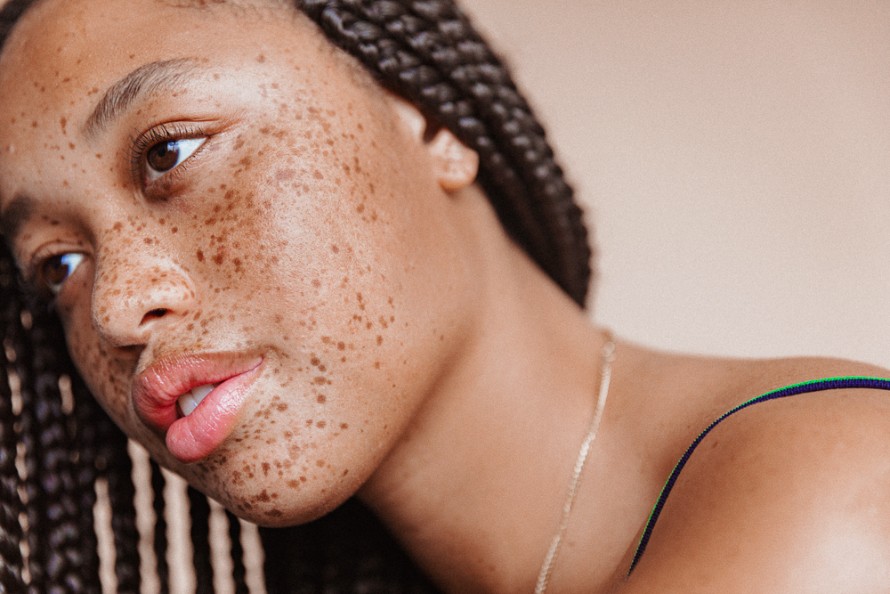 When I was maybe 15, I went to the beach and got a sunburn, and I lost a freckle in the middle of my nose. It’s back now, but I was like, ‘I can’t believe I was so irresponsible.’ Now I love sunscreen, but I also feel like a lot of the sunscreens you see in drugstores aren’t good for people of color because they’re so thick and white—they make your skin look gray and weird. Glossier’s sunscreen is super transparent and has a good SPF—I swear by that. I usually look at other people with freckles, like my mom or Adwoa or Tiffany Meia to see what they’re using on their skin. Being a woman of color with freckles is different. I experienced a lot of hatred on the internet when I was 14 and 15. It doesn’t bother me now, but at the time I was confused by it. I was like, ‘You know, people have freckles all the time, am I just the first black person that they’ve seen with freckles? What is the disconnect where they’re not normalizing me the same way white people who get freckles in the summer are?’ When I was younger, I would go out and kids would be like, ‘Hey Mom, what happened to that girl?’