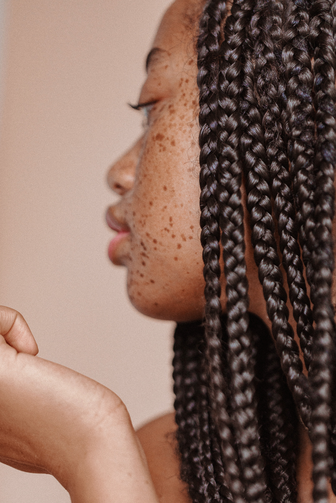 Right now I have braids which is awesome because it’s low-maintenance—if anything, I just have to oil my scalp, edges, and in between my braids to keep everything flourishing. Before when I had a weave, every time I went to a shoot I would do my hair first. It was a really low-maintenance weave with minimal leave-out, and people would say, ‘Oh, this girl has a lacefront, I can’t do anything,’ and I’d be like, ‘I don’t have that. That’s not what’s on my head.’ You never know if a stylist will be able to do your hair.