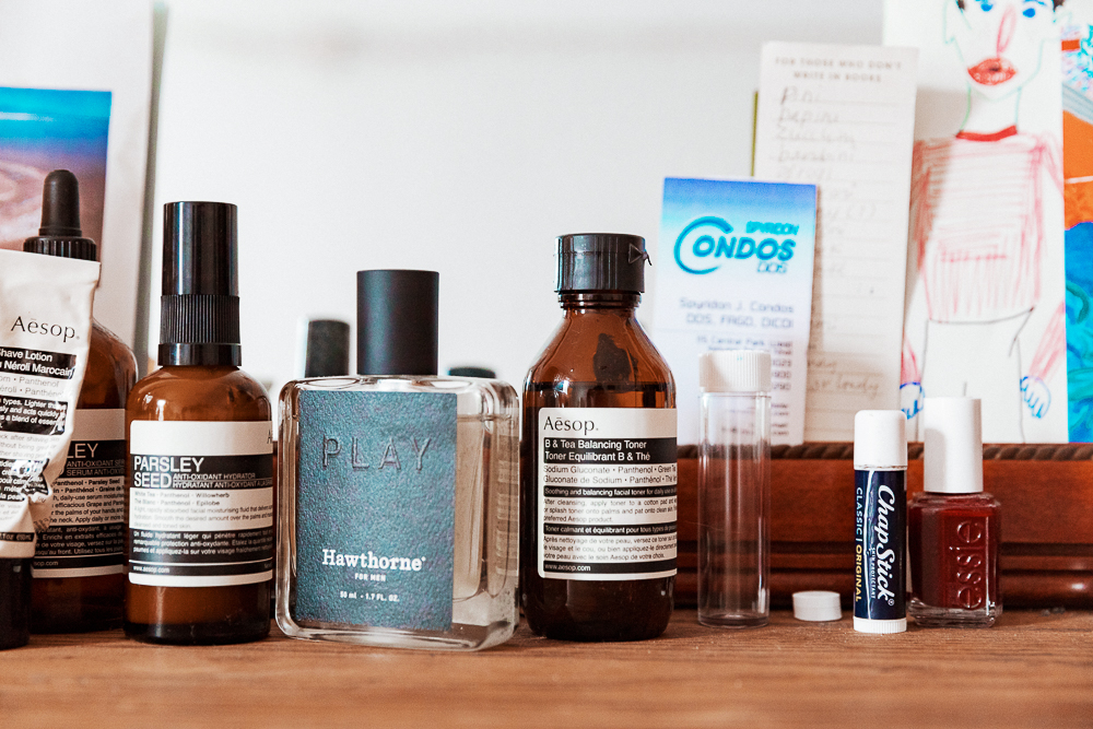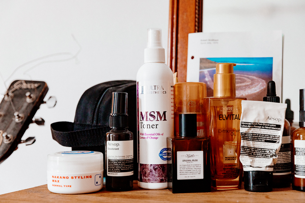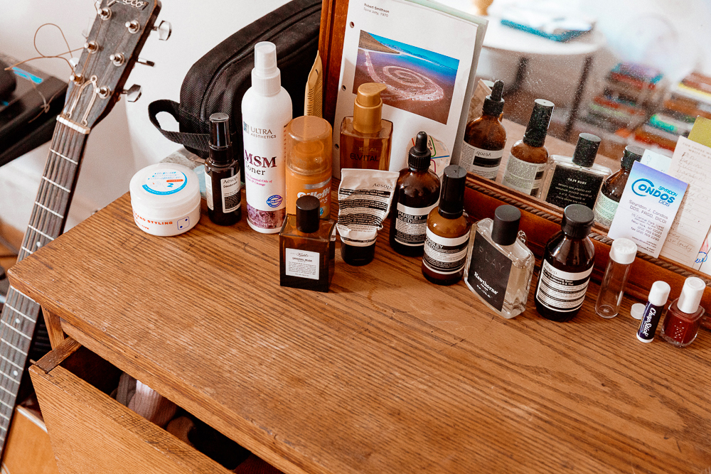 In a week I turn 30, and I’ve started to gravitate towards some more self-care things. It helps with a lot. I think if you take that kind of time for yourself you put out different, more positive energy. That sounds good to me. I really like how it feels to be clean and fresh, and smell good. I’ll save that moment of the day for when I need it the most, usually around 5PM, so I’ll shower and shave then. I really fuck with Aesop. I use the Parsley Seed Serum and Parsley Seed Moisturizer. It’s so obnoxiously expensive, but they hooked me. I like how it feels—maybe it’s in my head, but I feel like it’s calming, and there are good ingredients, and it smells really fresh. I’ll wash my face with it. Then I use toner—I have two. I use the Aesop Balancing Toner, but Ultra Aesthetics MSM Toner is pretty tight too. I like that it’s in a spray bottle, and I’m more inclined to spritz it on because it’s convenient. I feel like it does something—it also smells good. There’s this nighttime slop I put on my face, also from Aesop. It makes my skin feel really soft. If I shave, I use the Moroccan Neroli Post-Shave Lotion. I just use Gillette shaving cream and disposable razors—try to keep it sharp. I really like the Kiehl’s Blue Astringent—it feels good after shaving. It must have some alcohol in it, because it stings a little bit. It’s so expensive and it always gets taken away at the airport. I always forget about the bottle size rule on airplanes.