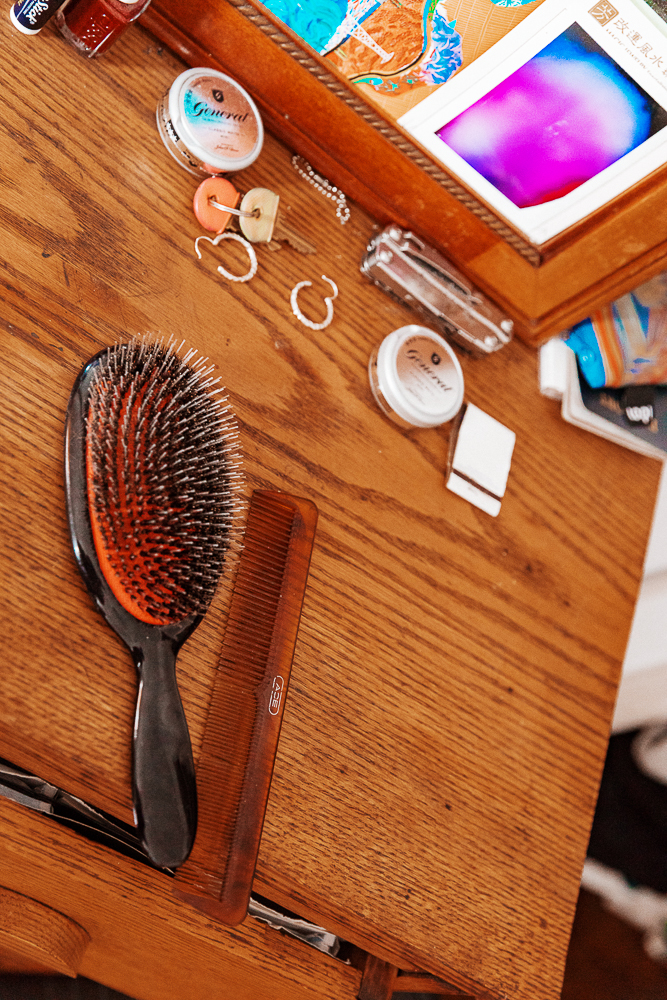 My mom had a Mason Pearson forever, but I couldn’t bring myself to spend—how much are they? Like 300 bucks or something? Insane. So I just went on Amazon and found one with five stars, and it was like 30 bucks. It feels so good. I got this Nakano Styling Wax from the guy who cut my hair. Oh yeah, I also like the Oribe Gold Lust Hair Oil. Back when I had bleached hair it calmed it down and made it feel less dead. I kind of switched to the wax now, because it’s a little heavier, and it makes it sit. I basically never wash my hair. I’ll rinse it with a bunch of water and scrub it out, but it’s been so long that my scalp has adjusted and doesn’t get greasy. I put wax and the oil in it every day, and it just works. I think your body remembers how to work if you’re not stripping it of everything. I cut my hair once every two months or so–it depends on the haircut. Like, when I had it bleached, it was a lot more maintenance because I would trim the sides and the bleach would be gone. It was kind of a nightmare. I’m trying to grow it out this winter so I can get it to a nice little bob situation. It is fun with the hair thing, knowing that in however many months I will be taking new press photos, and I like the idea of them being different than the old ones. Some people know what they like and stick with it, and that’s their look, and that’s cool. But I’ve always been interested in trying new things, and different clothes and hair. I’ll look back and there are some things that I’ve tried that I’m like, ugh. Excruciatingly bad. I hope no one ever sees those pictures of me with like, a beard and aviators. But it’s also fun to experiment.