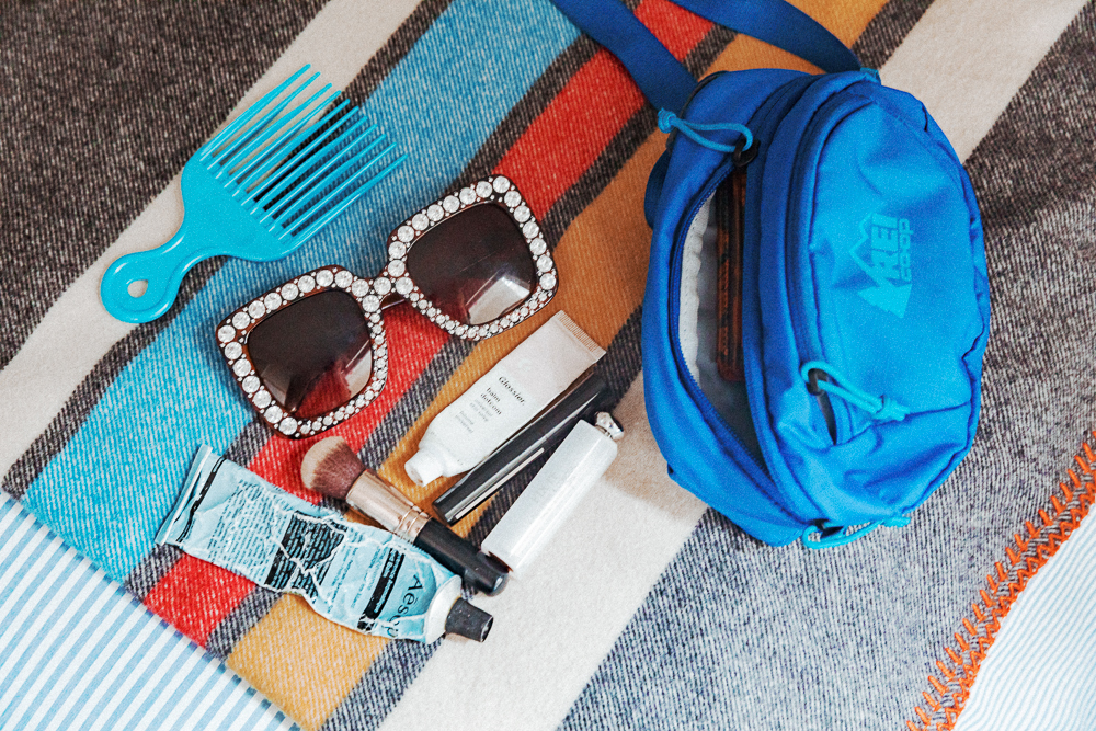 If I’m going out, I’ll use the Glossier Haloscope highlighter in Topaz—that’s my favorite. I’ve gone through like five since they came out. I have this one Urban Decay blush that I love, and I’ll do a Kawaii blush style, so right under my eyes and into my cheeks. It’s like a really pink fuchsia. I do that with the Glossier Cloud Paint, too. I’ll put on some brown Smashbox waterproof eyeliner and Milk Makeup Kush Mascara, which is lovely because it doesn’t get all crusty. Sometimes I’ll do a clean face with just balm on my lips, and then a really bold eyeshadow. I use this Sephora eyeliner-to-eyeshadow pencil—it’s like a jumbo stick—or I’ll use the Make Up For Ever pigment in red, and I’ll smear that on my lid. I have one in yellow, too. Then I’ll put on some Fenty Gloss Bomb—I love it! It’s the best going out lip gloss, it lasts forever. I wear lipstick occasionally, but I’m a very fidgety person and I like to eat, so whenever I have lipstick on it messes up immediately. I like the Bobbi Brown Lip Crush Lipstick in a berry, and the Dior Lip Stain in a coral. And the Fenty red—if I want to slay something, I just put that on, red dress, out the door.