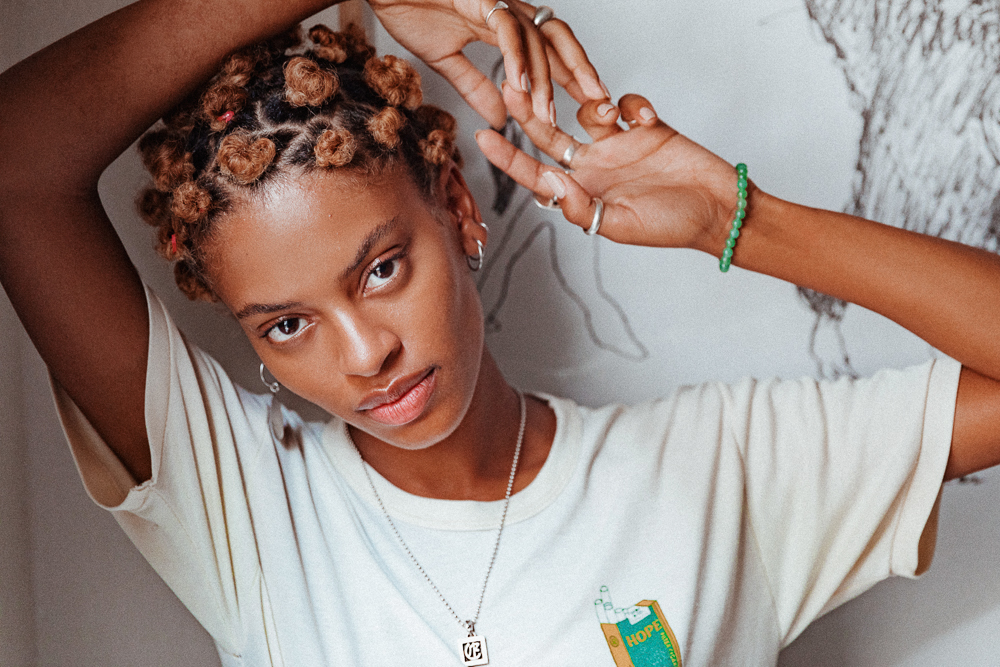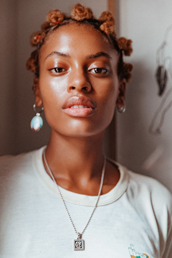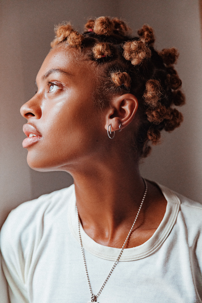 I’ve had my hair shaved for the past year, and I just started growing it out in February. I might shave it again, because honestly it just feels like a clean palette. When I have hair, my mood and disposition changes depending on what hairstyle I’m wearing. With these Bantu knots I feel super fun and cute, but when I had my Fulani braids I was very ethereal, and when I had my long, blonde braids, it was very early-2000s Ciara. It was a little weird [growing up with a white mother]—my mom did my hair, but only up to a certain age. When I turned 11, we decided to relax my hair. My dad relaxed it—he always did it—because I think the chemicals stressed my mom a little. When my hair was relaxed, it was kind of like, ‘You can handle it now.’ But the reason I shaved my head was because I didn’t want to keep relaxing it. My roots were super kinky and my ends were straight—it was a mess. I missed out a lot on black hair[care], and the last two years I’ve been going through a rapid education. When I shaved my hair, I had just learned how to French braid, and I was 20 years old. I never had braids, I never had cornrows, I had never been to a hair salon—I didn’t know anything about that world. As soon as I shaved my head, suddenly I was learning about all these things you could do with black hair, and all the things you can do with curls. Since then, I’ve experimented with different types of braids, and extensions, and wigs—this whole world of creativity that I didn’t know about. It’s a self-taught journey, and the internet helps a lot.