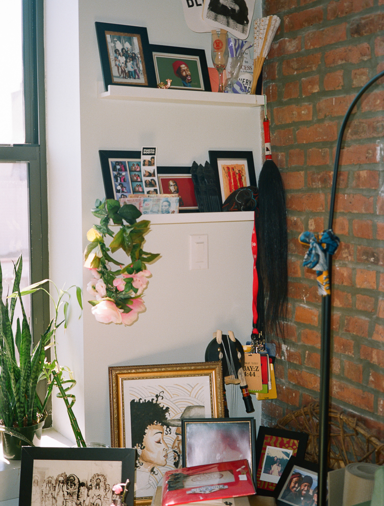 There's this new line that I use called Curls Dynasty—I really like the packaging. With natural hair, if you’re doing it when you’re showering, you need products that can get to your scalp. With this stuff, they put it in a spout so I can get it onto my scalp, which is the most important part. Then they have this Organic Oil Blend that you put on at the ends, and that gets the hair shiny, but it’s also a really nice natural conditioner. The line is really good. I also use Shea Moisture, and they have a curl moisturizer situation that you put on at the end. If I’m wearing my curly fro, I wash it practically every day, because when I sleep it just gets so flat and squished. With curly hair, there’s a lot of breakage that happens. That’s the only downside. I’ll do braids sometimes, usually in the summer. My friend Medilla braids hair, so I’ll just go to her house to get them done—she's great. She’s very into natural, holistic kinds of things, so she’ll soak the hair that she uses for the braids in something that gets all the buildup off, which prevents your scalp from feeling itchy. Usually the hair is treated with some type of chemical. She cleanses it and she uses this flaxseed gel—she’s just really into maintaining your hair under it. I have a couple of silk pillowcases, so I can change them out a few times a week. They can lead to breakouts if you don’t change them enough. That’s why my hair is always a mess in the morning, because I don’t cover it, I just sleep on it. I don’t like to fool with bonnets—it’s just easier when I travel, I can take my pillowcase with me.