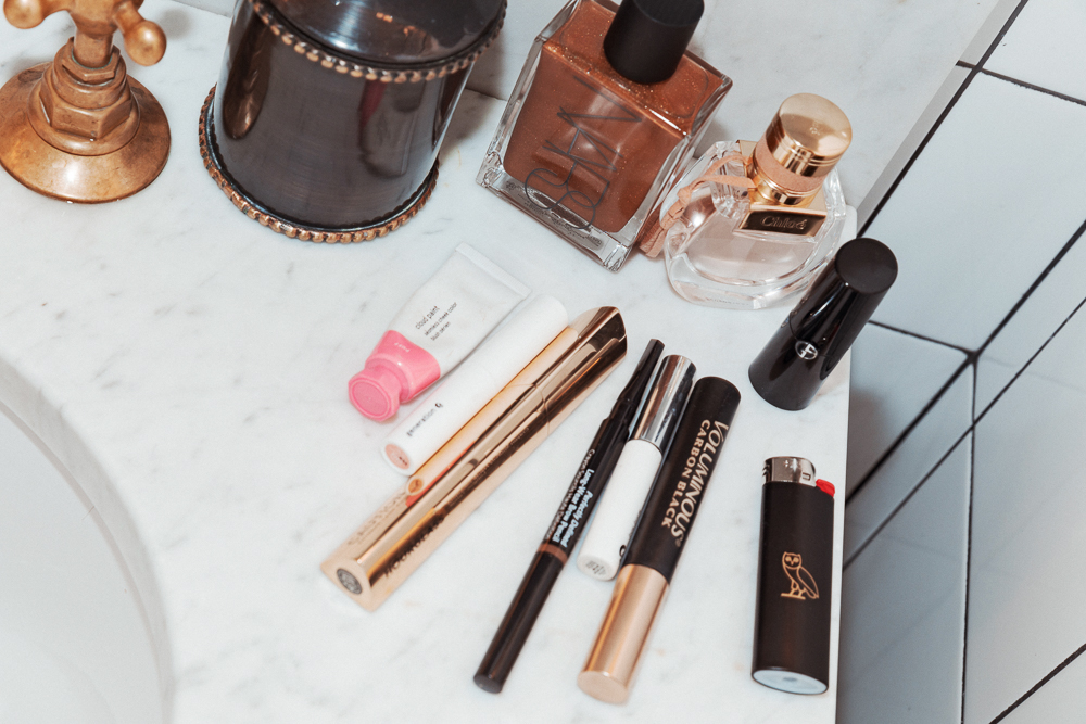 After my skincare, I like to use the Hourglass No. 28 Base Serum. It also smells like a spa. That’s nice, and then I do the Estée Lauder Double Wear. My shade is 2W2 Rattan. I’ve gone back and forth and tried so many different brands and that’s been my favorite. I like the finish—it’s kind of matte. My skin’s a little bit more on the oily side, so I like that. Then I like the YSL concealer, just under eyes and a little bit on spots. I use the Glossier Haloscope—this one is Quartz. I have two brow pencils—either the Bobbi Brown pencil in Taupe or the Anastasia one. My favorite mascara ever is just the L’Oréal Voluminous Carbon Black. This is better, in my opinion, than any expensive mascara. It elongates and curls—everything all in one. Whereas some make it too clumpy, this one’s not clumpy, which I love.