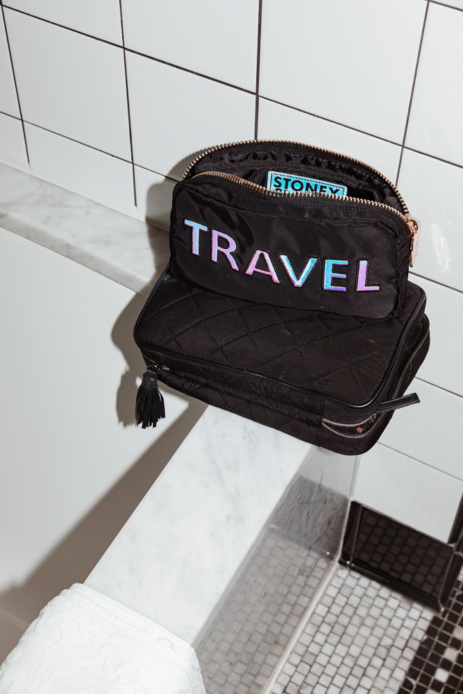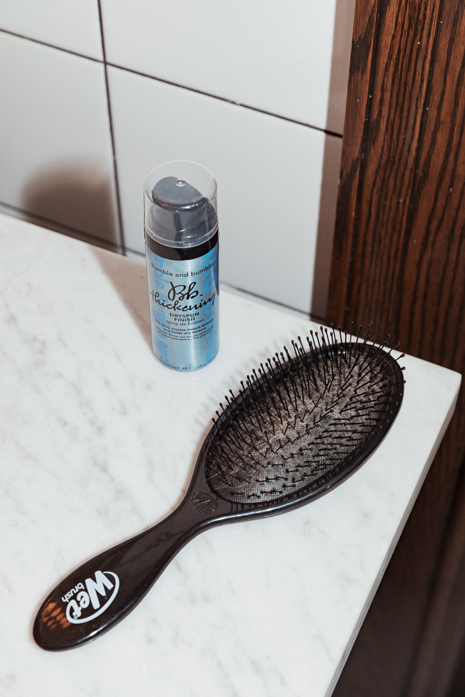 Right now, I only have travel-sized shampoo and conditioner, but typically I love Living Proof. It's a Boston-based company and I like supporting local brands. And I don’t use hotel shampoo and conditioner unless it’s a really good brand, or I really don’t have anything else to use. I used to not care at all—I definitely have gotten pickier about that. Dry shampoo, always—I use Living Proof PhD, the Oribe Dry Texturizing Spray in the black bottle, and the mini Bumble and Bumble one. I try not to use that much hairspray, because I think it’s not necessarily great for your hair. So I use those instead.