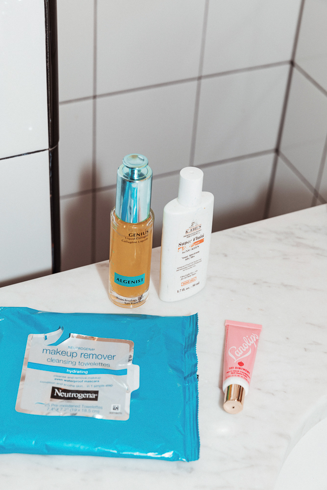 When I did Dancing With The Stars, we had an insane amount of makeup on our faces. We’d start hair and makeup at 7AM—the live show wasn’t until 5PM, so it was that entire day of being caked in makeup. And then I’d have to take a red-eye that night to New York to come back to school. The first few weeks, there were times where I was rushing to make my flight, and I didn’t have time to take my makeup off. You walk onto a plane looking like you’re absolutely crazy, because it’s costume makeup basically. I was like, ‘I can’t do this.’ Now I always take off my makeup before I board a plane. I use the Neutrogena Hydrating Wipes—they’re the best, especially with eye makeup. Mascara, eyelash glue, eyeliner—whatever it is, they take it off really well. After that, the Kiehl’s Ultra Facial Oil-Free Lotion is an easy, pretty neutral moisturizer that I always have in my bag.