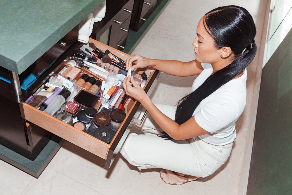 For the record, this is all my own hair. I look the best with long hair, although I think I need to cut it at this point because I slam it in my car door all the time. I trust Jen Atkin—she’s one of the best, but she gets scissor happy. She’s like, ‘Should we cut your hair?’ I’m like, ‘Every time I see you? We’re out at a restaurant!’ I alternate between the Ouai shampoo and conditioner, and whatever else. Right now I’m really loving Biolage—my mom and I used to use it when I was growing up, and I just love the way it smells. I could wash my hair every day and be fine. It’s just the texture of my Asian hair, I guess—my dad is Japanese. Cass Kaeding colors my hair because I have a little patch of grays. I always joke with her like, ‘I’m ready to go blonde!’ I sleep with my hair in an old school scrunchie. Sometimes I put it over the back of my bed or the back of my pillow.