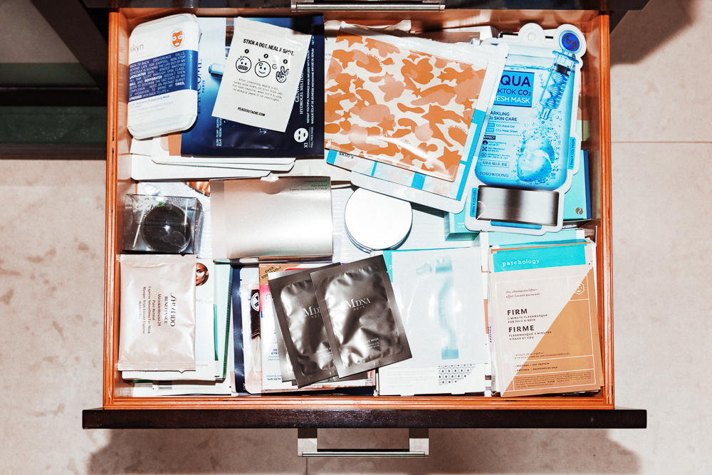 When it comes to skincare, I use these Yes to Tomatoes face wipes. I like that they’re not oily. I get oil bumps really easily, and those are just clean and pretty natural. For face wash I use my dermatologist’s—Christie Kidd. She changed my skin, changed my life. I only use her cleanser and I cannot live without it. It’s just so clean, and it’s really thin. If I’m going to put makeup on, I put on Charlotte Tilbury’s Magic Cream first. I do tone with the Christie Kidd toner, but it depends on how my skin is feeling. I’ve kind of got it down to a science—I know if it’s too dry, or if I shouldn’t do the moisturizer. If I don’t wear makeup then I really like the Dr. Sebagh Luminous Glow Cream. It’s a little pearly, so it just kind of gives you a glow. The Drunk Elephant night serum I do once a week—it’s so cute, isn’t it? My favorite sheet masks are from this brand, MaskerAide. It’s just a super easy thing and they hydrate. I also like the Patchology masks—I like to put them in the fridge because they’re really gel-y. And I’m excited to try the Shiseido ones—apparently these under eye ones are really good, the Benefiance Wrinkle Resist ones. TBD. There’s something, too, about the mental part of putting it on. And I do like these Peace Out Acne Healing Dots. The Dead Sea Mud I’ve got on deck, just in case I want to do a full-body mask. And I like this nighttime cream from Dr. Sebagh. I just do neck and chest—always neck and chest. The MDNA Rose Mist is a really good spritz. And then this thing which is so crazy that I got on Amazon. I don’t really even understand the directions—there are spelling errors and they don’t make sense. It’s like a zapper. If you have a pimple somewhere, you just kind of zap it and it literally gets rid of it in a day. It’s a Portable High Frequency device. I think my friend’s mom told me about it.