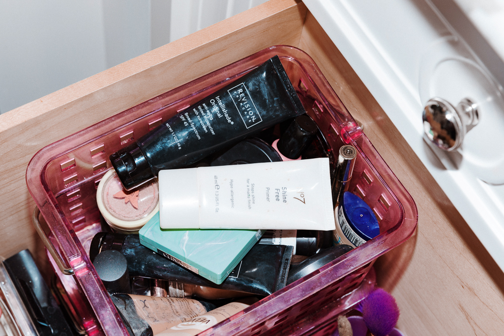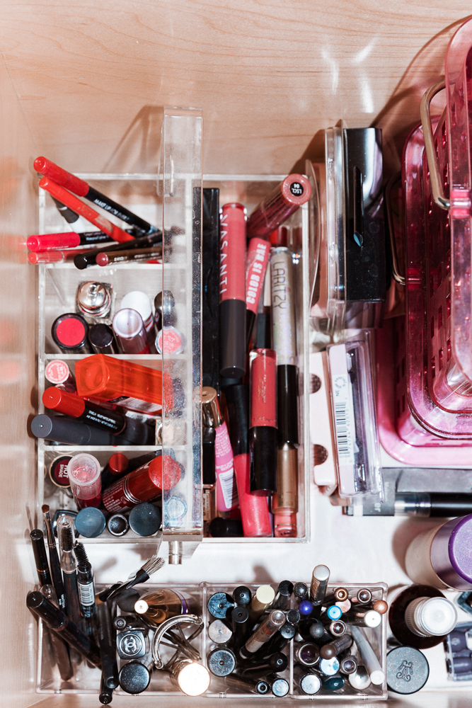 If I have something during the day that I want to look good for, I will use tinted moisturizer, or I’ll even just use a little foundation mixed in with my moisturizer if I don’t have the right tinted moisturizer around. I’m big on that, and then a little bit of eyeliner. I have a little bit of everything—I have a Benefit one I use a lot, and I have a MAC one I use a lot. For liquid liner, which I really like doing, I have a really good Kat Von D one, from Sephora. I like to curl my eyelashes and put on mascara, and a little lip balm. For mascara I just use Maybelline Great Lash, the waterproof one. I really need a waterproof one, because I’m outside so much. I put the Kiehl’s balm on every day and every night. I have a couple tinted ones. I’m really simple and natural, but because I don’t get a chance to wear makeup during the day a lot—and now because I have an almost five-year-old son I don’t go out at night as much as I would like—when I do get the chance to go out, I really have fun with makeup. I used to do a lot of art, so I think I’m really drawn to painting, coloring, and things like that. So much of putting on makeup is like painting your face, understanding how to use a brush or a liner, and actually having fun with it. I don’t use so much [foundation] because I like my natural skin, but I will do some for nighttime. I rarely use primer—I have one from No7, but I always forget to put it on. Then once I put on the foundation I remember instantly. I have the Sweet Cheeks blush from Bombshell Cosmetics, and I like it because it’s the only blush that I have right now. [Laughs] It’s just what I use! I like doing a lip—especially because I have dark hair, I feel like doing a liquid eye and a bright lip is a really great look. I like a really good strong red, like this one from Trestique. I always love things that are smaller in size when it comes to cosmetics. Because I don’t wear so much makeup, I don’t go through things as much as some people do. I also travel a lot, when something’s in a smaller package it seems better. I don’t need a huge lipstick, or a huge thing of blush. I need something small that I can travel with, and that I will use.