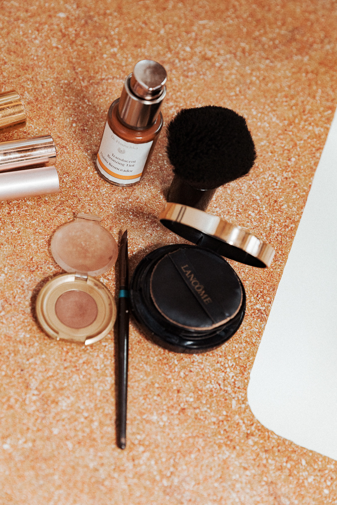 For skincare I only use my own stuff, but the truth of the matter for makeup is that I use what I get from gift bags. I’ve been using this Lancôme cushion compact recently. You can apply it in layers, and it just evens out your skin tone. But my favorite is eyebrows. I use a little angled brush, and a Purepressed powder from Jane Iredale. It’s also essential to always have good tweezers. I like to keep one in my car, because when you’re in LA in traffic, you see every hair that needs to be plucked. I just pluck the loose ones out—there was a period of time where they were super thin, because that was the style back then, but I’ve let them grow in over the years.