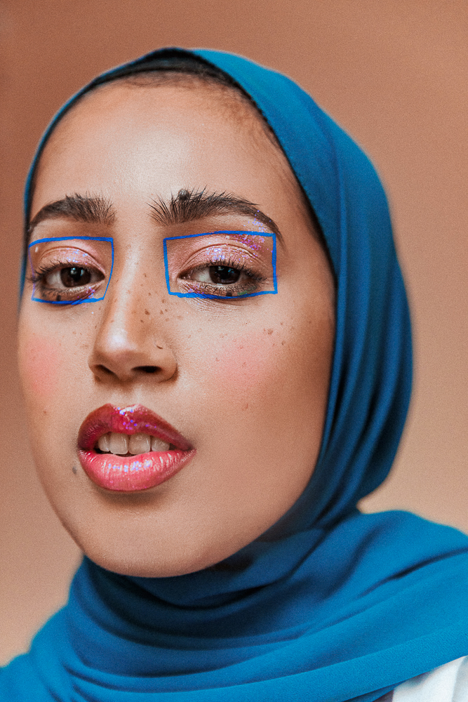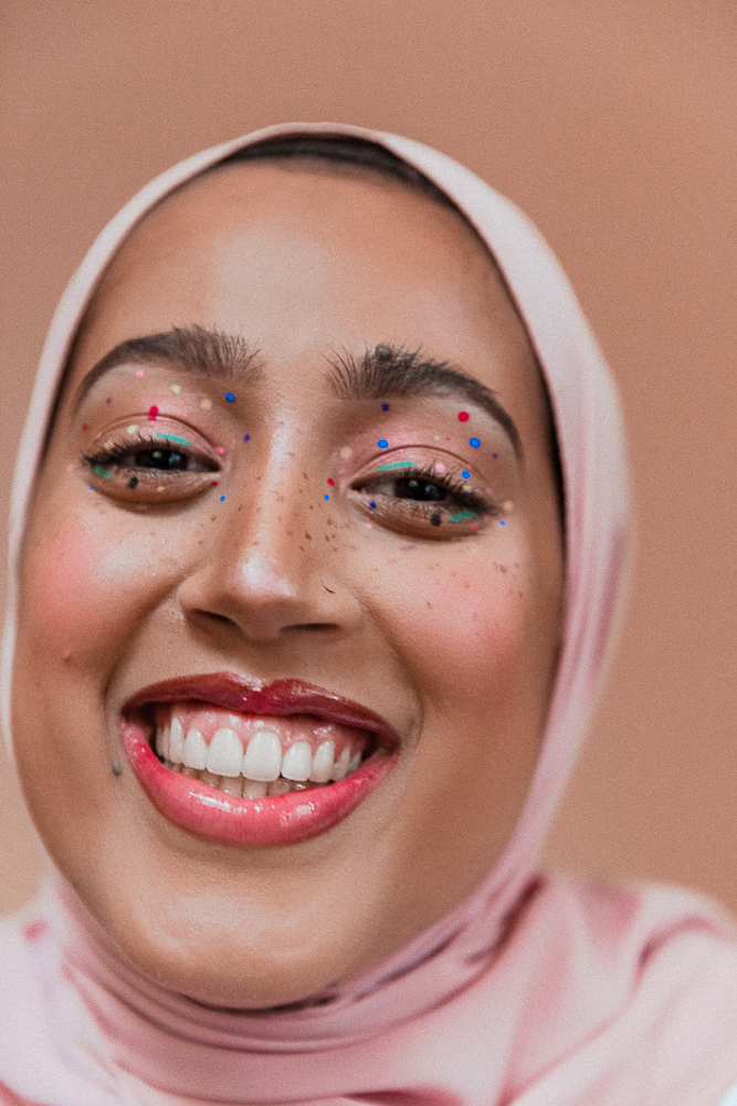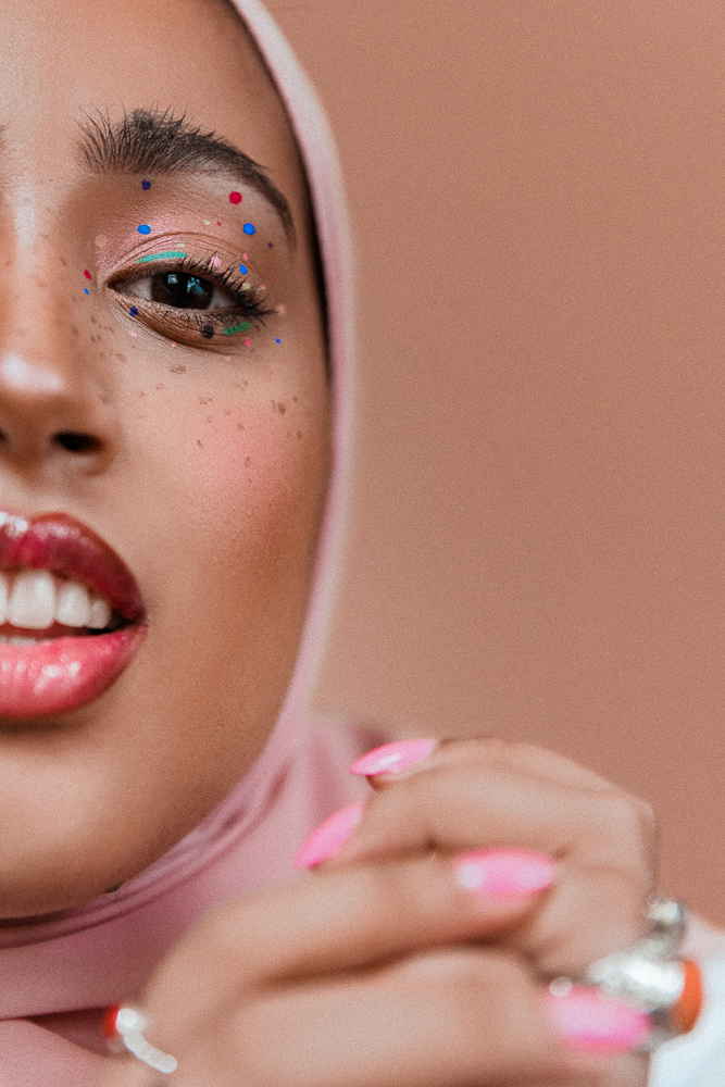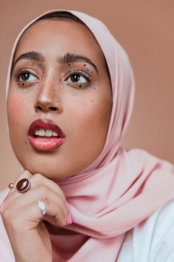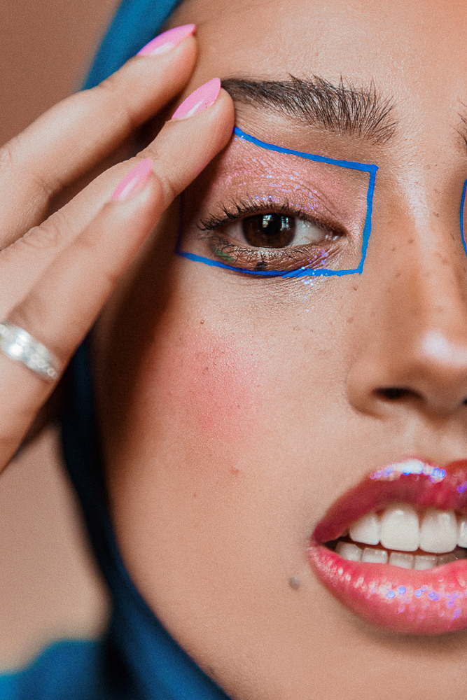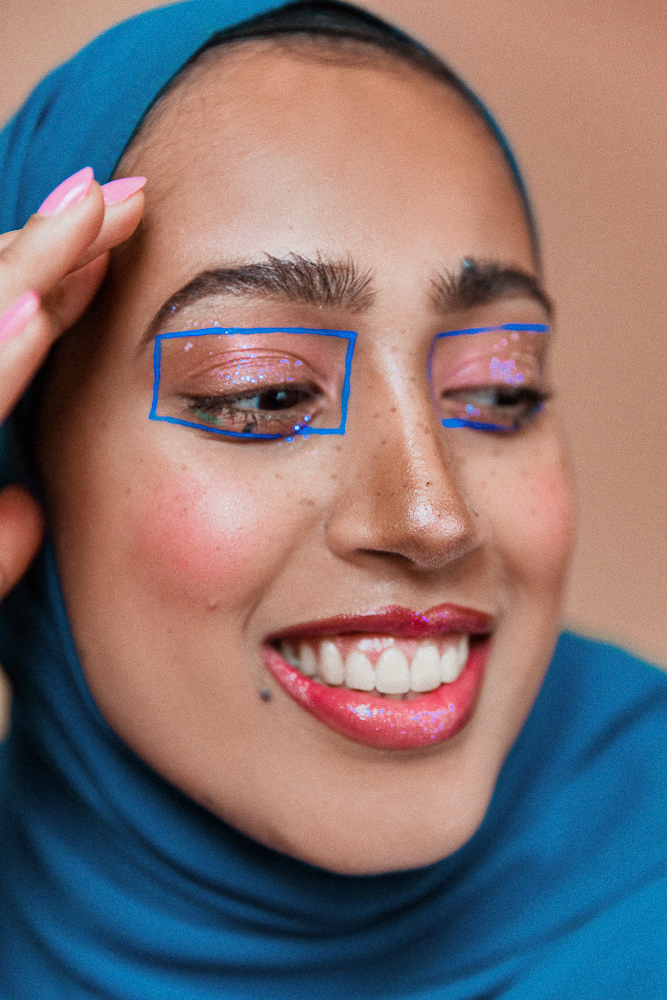 Salwa Rahman, wearing Urban Decay 24/7 Glide-On Eye Pencil, NYX Vivid Brights Eyeliner, and Anastasia Beverly Hills Brow Wiz. Photographed by Tom Newton in London on November 9, 2018.
