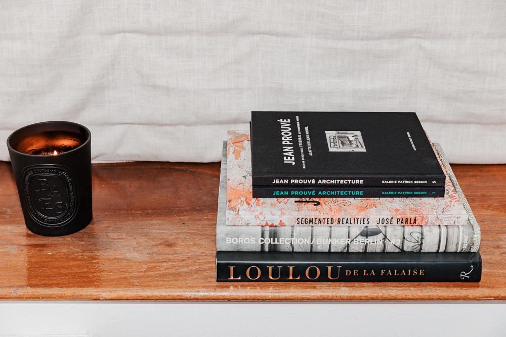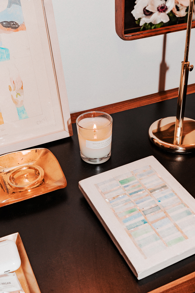 Every day I do a yoga class on my phone called Beachbody. I’m addicted—in the cult, 100-percent. It might not even be that good, but it’s good for me. You know what it is? Time efficiency. A half hour, every day, to myself. And then I have candles everywhere—always. I love APC’s scents, and they’re down the block. This one is No. 2, Jasmine. I think that fresh flowers should be invested in. Fresh flowers can really make your home. One of the best things about living in New York is I’ll go to the deli [to get flowers].