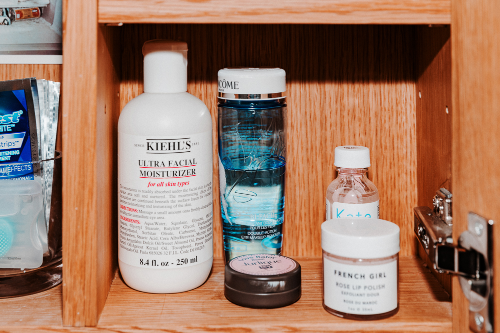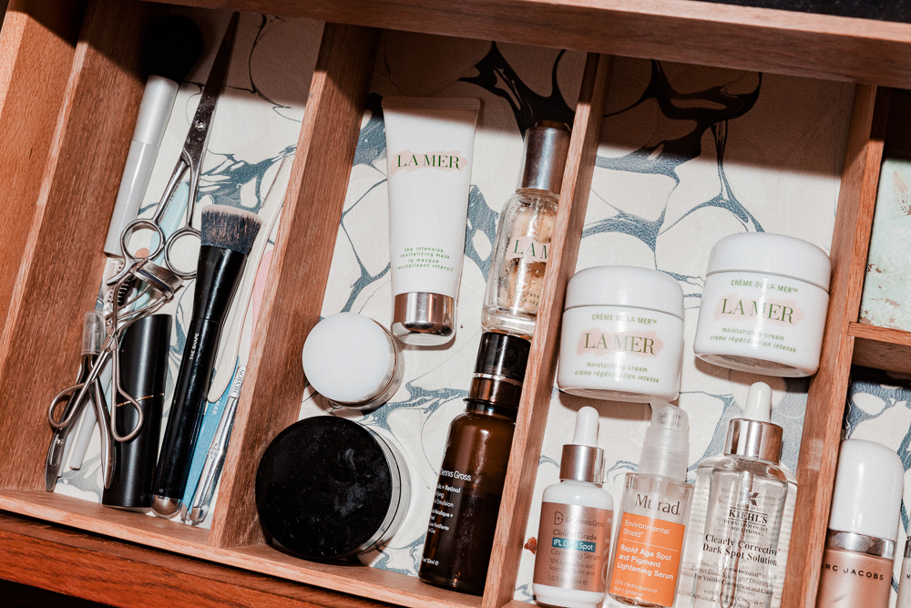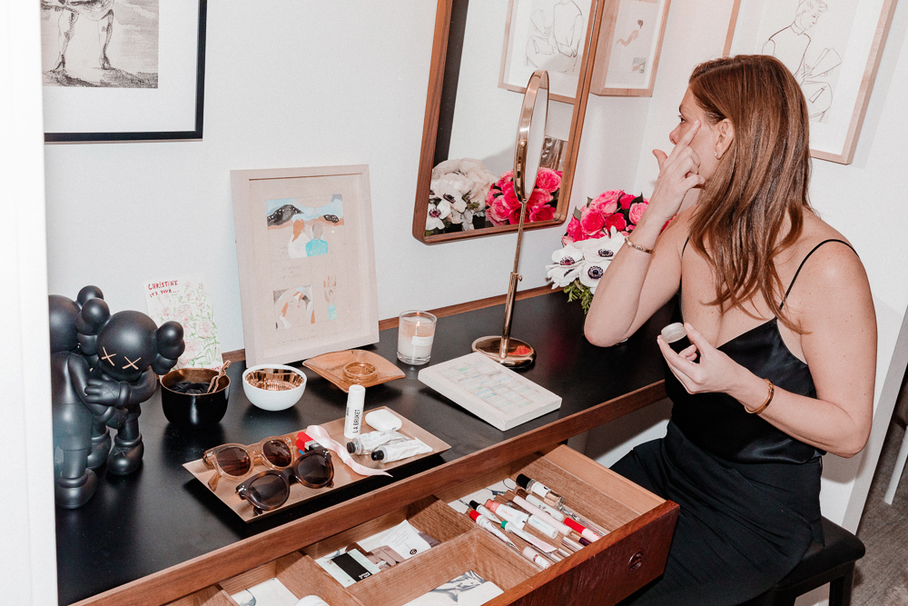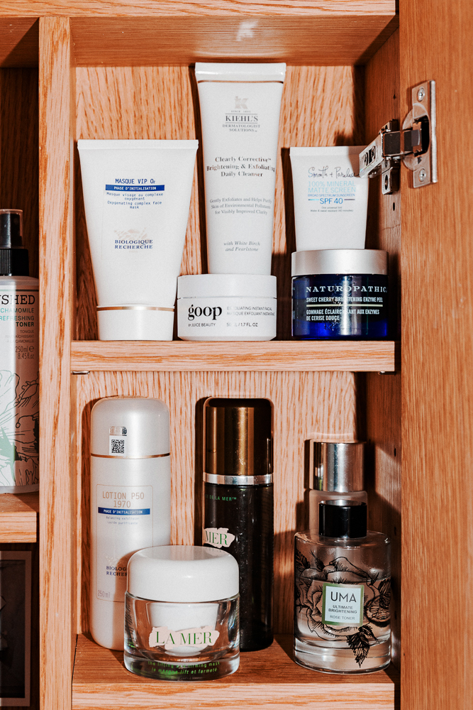 I’ve always struggled with acne a bit, but I think Proactiv and this Kate Somerville Acne Spot stuff really works. My first face wash of the day is always Proactiv, and then I’ll do more of an alpha beta wash—I double cleanse. And then I do a lip polish—I love the French Girl Rose one, it really plumps you up. After that I’m either on the Uma Brightening Oil, or SK-II. I use La Mer both morning and evening, and I will use Kiehl’s Ultra Facial Moisturizer throughout the day—I’m constantly moisturizing. I also mask a lot. I tried the Goop mask for the first time, and it didn’t work out well, let’s put it that way. But the Cherry Enzyme Peel from Naturopathica is a good one, it clears your pores out. I love the scent, but it’s a little strange. I switch it up with this one from La Mer, which is for firming.