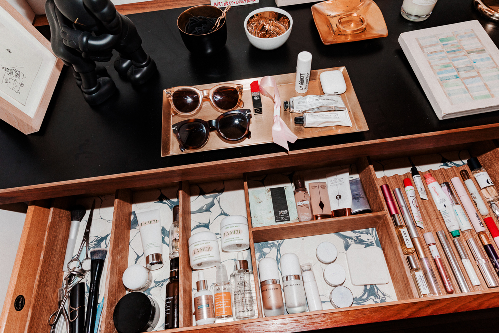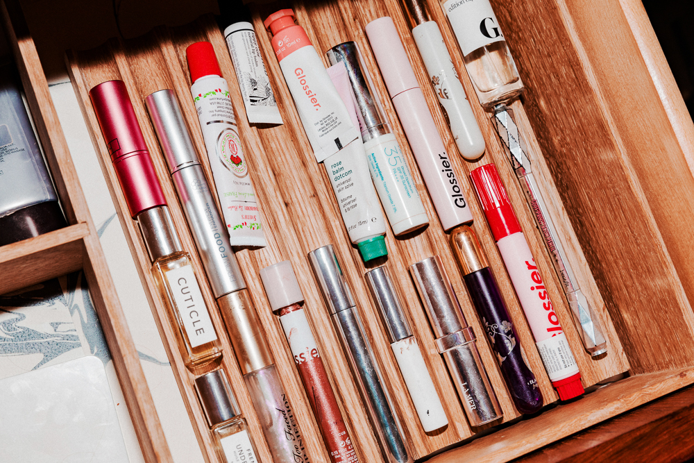 If I’m going to an event, sure, I’ll wear foundation. La Mer does an amazing one, and also a little stick concealer—I use that to cover spots. I wear mascara pretty much every day, the one from Glossier. Their wand is great. And I’d say if I had only one thing I could do, I would do eyebrows. So I have Boy Brow in Brown.